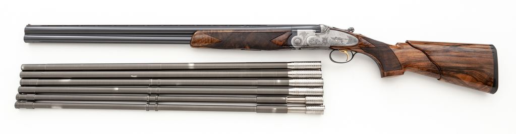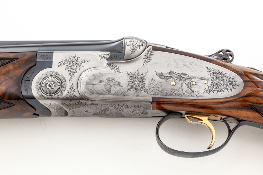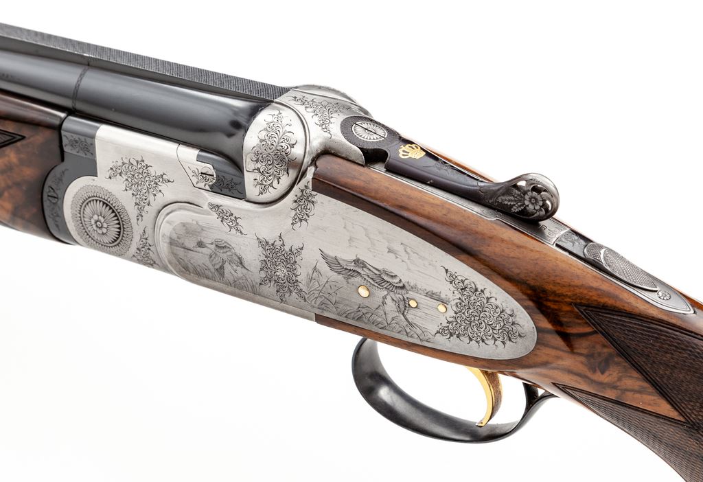 Beautiful Beretta SS3EELL (SO-3EELL) Sidelock Over/Under Skeet Shotgun, #C101248, 12 ga., 28'' (71cm) vent rib barrels fitted for Briley choke tubes (5 included). Lockup is via Kersten crossbolt plus adjustable lugs on top barrel. Action is a true sidelock, satin finished, with single non-selective trigger and non-auto safety. Fantastic engraving has extensive scroll border engraving on lockplates, receiver and triggerguard, with Bulino-style engraving of ducks in centers, mallards on right, pintails on left and bottom. Trigger is gold plated, and inlaid crown on action lever is gold; lever is engraved and pierced. Full forend and pistol-grip buttstock are Exhibition Grade walnut, with 26 LPI checkering. Buttstock is hydrocoil; pump is included. Mfg'd 1984. Condition is near excellent, approx. 95%-96%, with some use wear to checkering and buttstock at motion. Satin metal has some dulling but no mars or gouges. Contained in a Briley metal hard case, with 20, 28 & .410 titanium skeet tubes. Est.: $7,500-$9,000. (Modern)