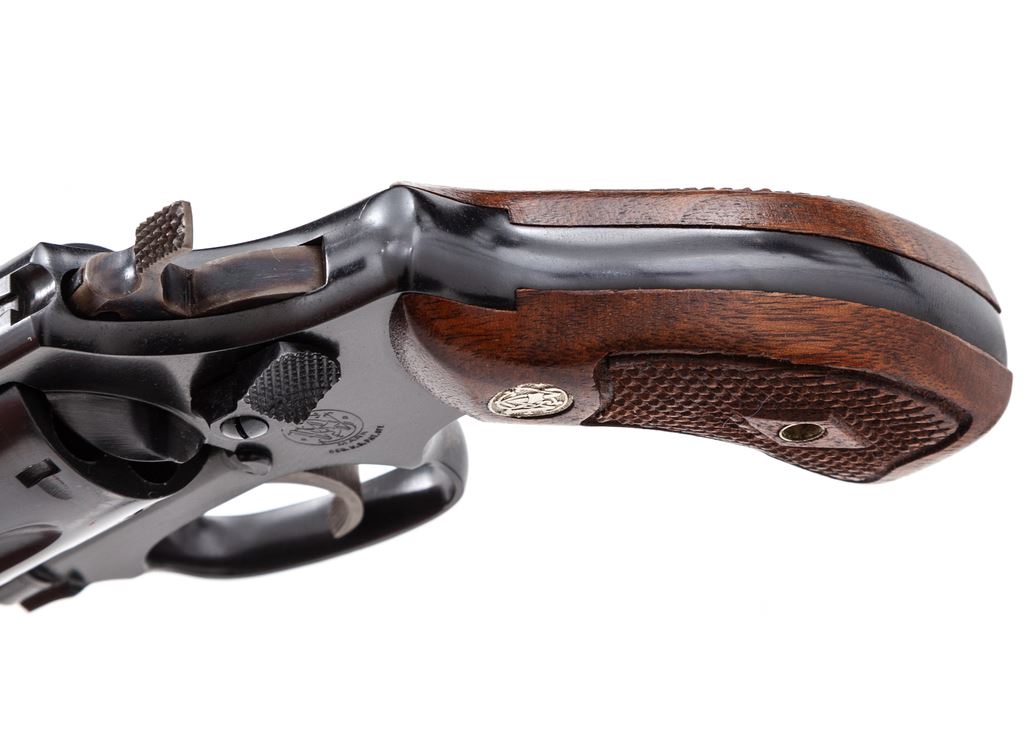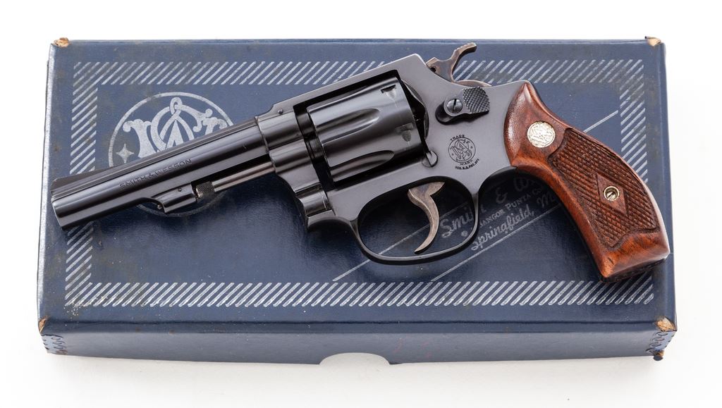 Smith & Wesson Model 30-1 .32 Hand Ejector Double Action Revolver, #771148, .32 S&W Long cal., 4'' pinned barrel, blue finish, factory checkered round butt diamond center magna walnut grips with S&W medallions, serrated ramp front sight and standard square notch rear sight, on a 3 screw J-Frame with standard production thumb latch. Shipped June 1966, with information sheet from Roy Jinks. In a correct two-piece blue Bangor Punta box with a collector's label added, parts list/instruction manual, and S&W packing paper. Condition is near excellent with 99% factory blue showing a very light index mark on cylinder. Hammer and trigger exhibit strong case colors. Crisp grips and action, bright bore. Est.: $500-$700. (C&R/PPT)