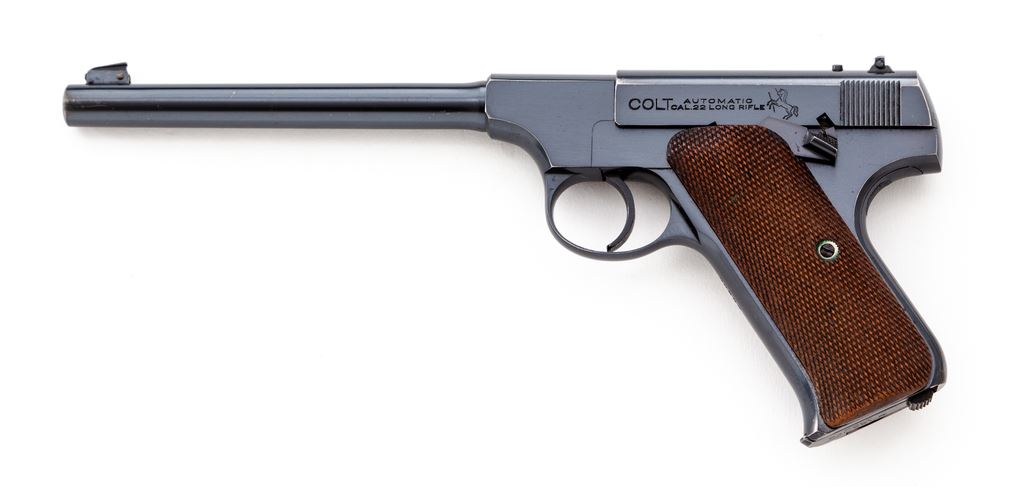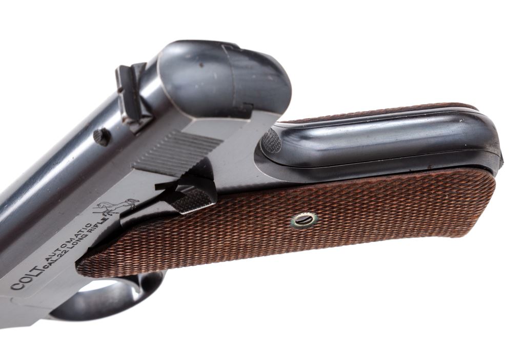 Colt Pre-Woodsman Semi-Automatic Pistol, #36997, .22 LR cal., 6.6'' barrel, blue finish, checkered walnut grips, adjustable front and rear sight, with one factory magazine; magazine base is marked ''COLT / CAL. 22 L.R.'' Frame and slide with matching numbers. Mfg'd 1923. Pistol rates as fine and retains approx. 96%-97% original blue. Metal with scattered small surface nicks and scratches. Maker's marks are clean and clear. Grips shows moderate wear for their age, including some flattening to the checks and a little more noticeable wear along the bottom edges. Fine action with an excellent bright bore. Est.: $600-$800. (C&R)