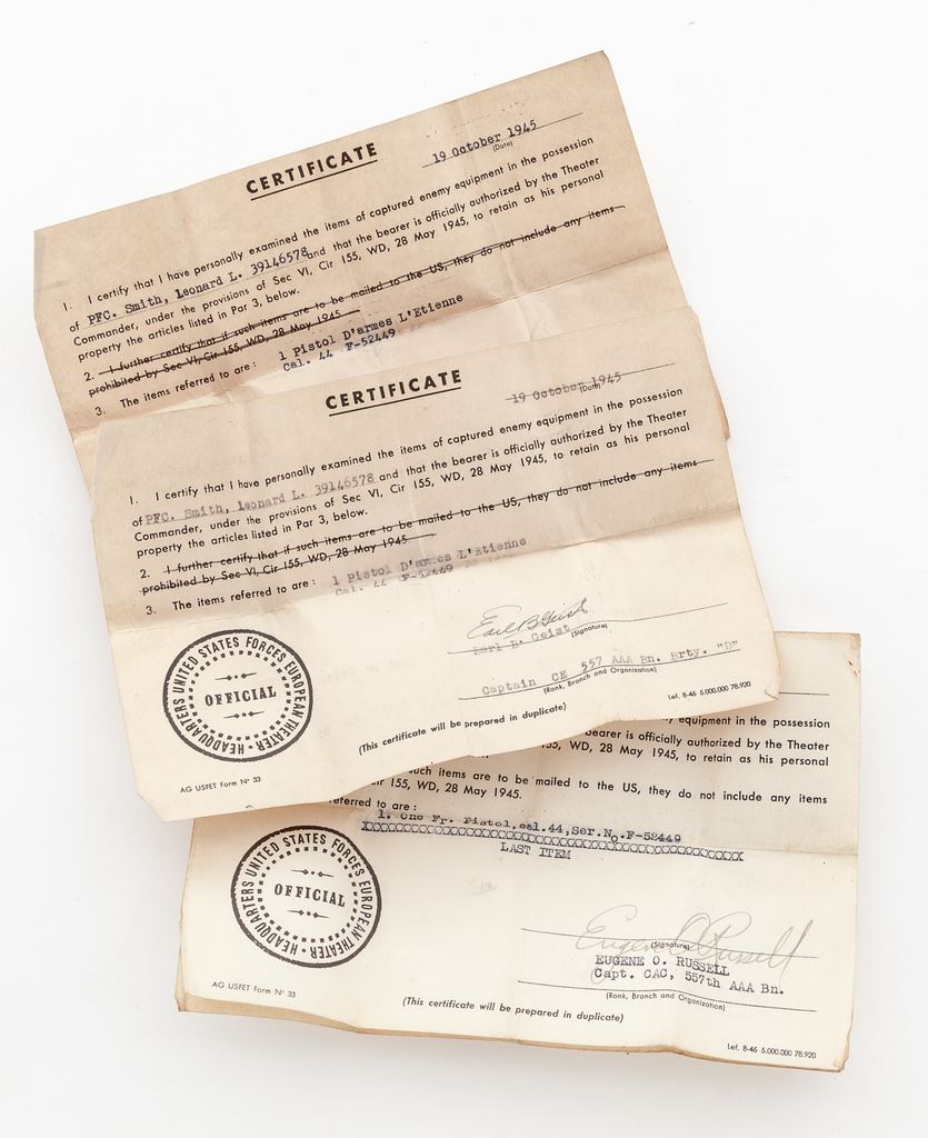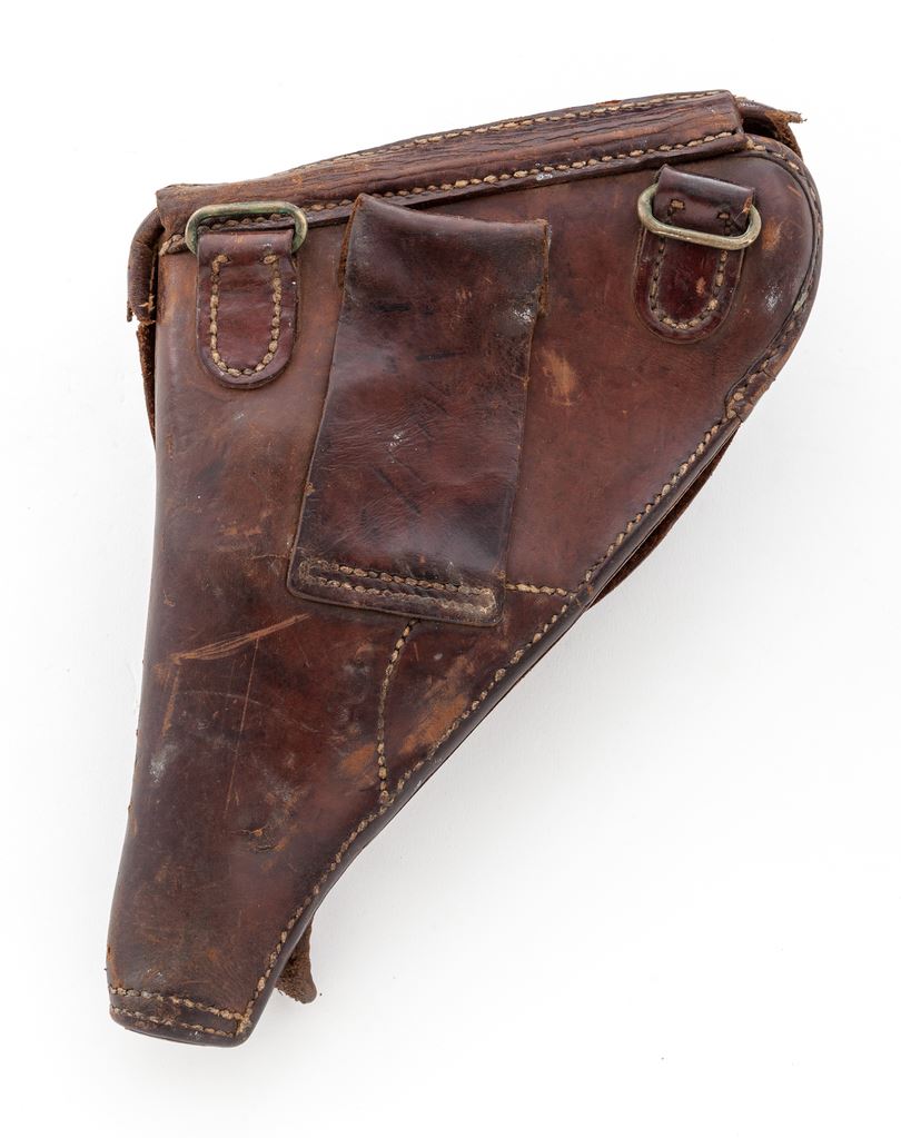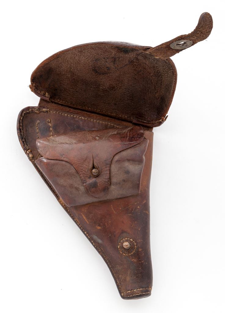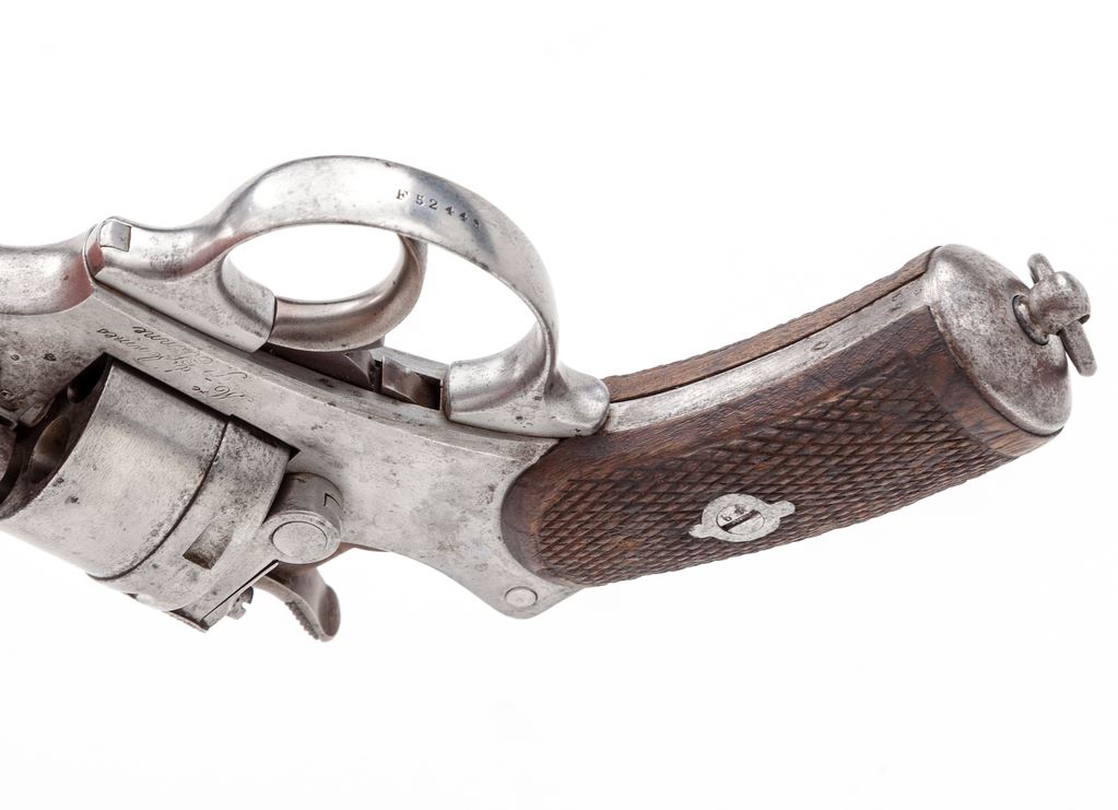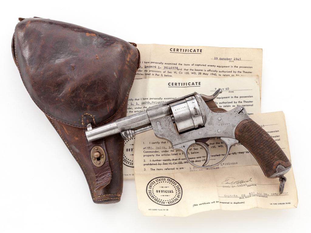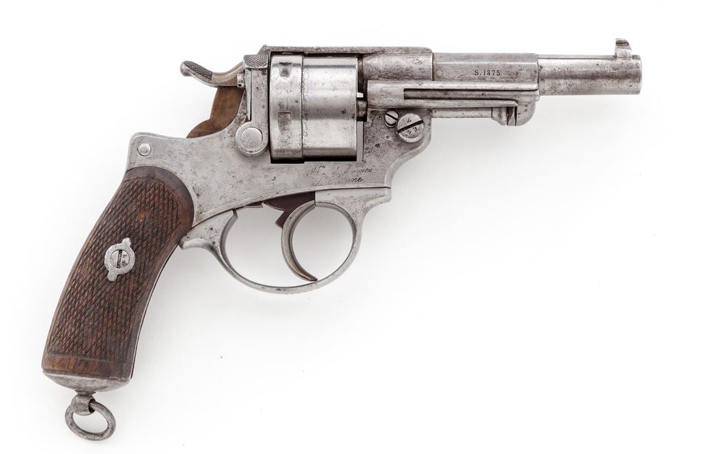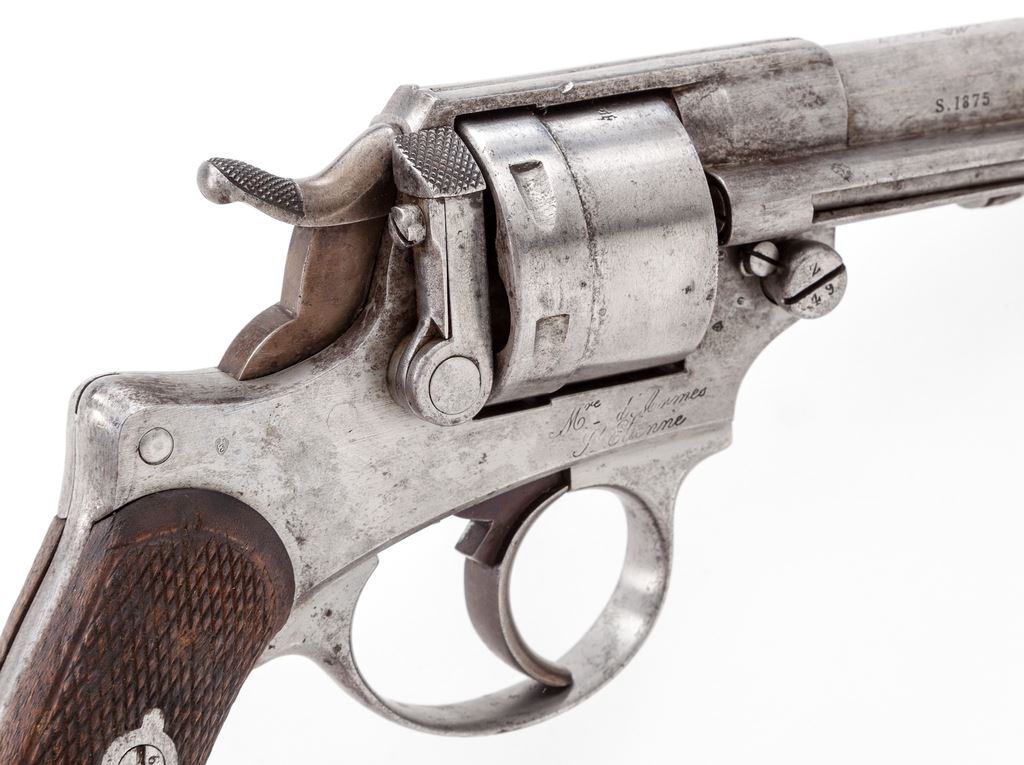 French Model 1873 Double Action Revolver, with holster, #F52449, 11mm, 4.7'' barrel, finish in the white, checkered walnut grips, lanyard loop in butt, marked ''Mre d'Armes/St. Etienne''; right side of barrel marked ''S.1875''. Includes WWII bring-back document dated 19 Oct. and 7 Nov. 1945. Condition is fine with minor carbon spotting overall. Straw colors to hammer are 95% present. Grips with knackering from storage. Good action, bright bore. Holster is a little tattered with stitching loss to outer clamshell. Est.: $400-$600. (Antique)