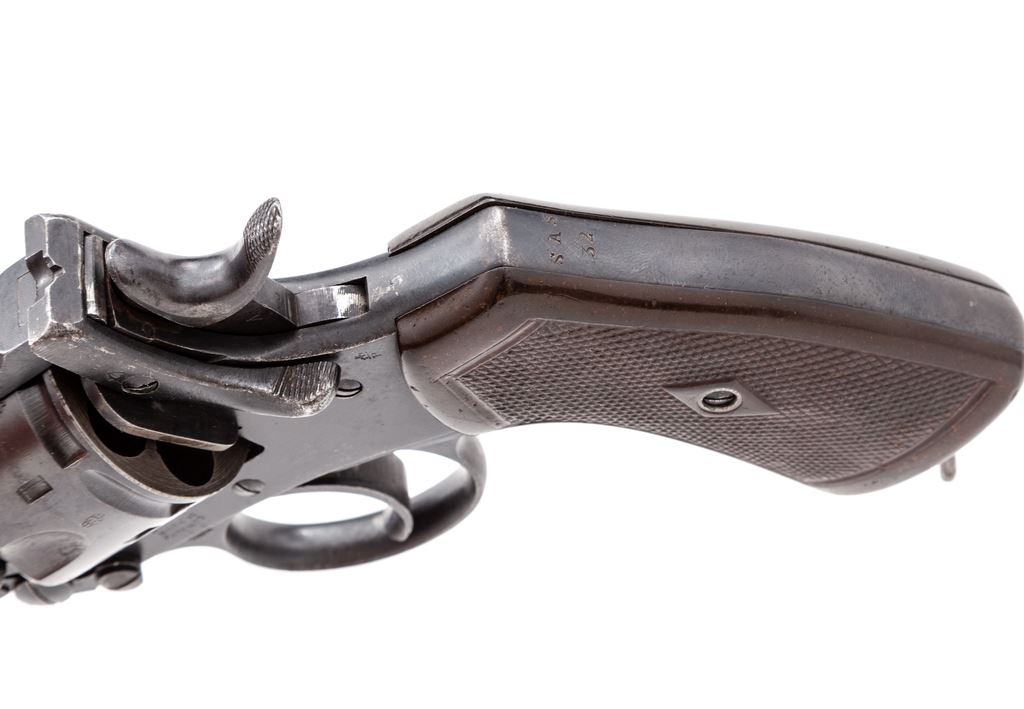 British Mark VI Webley Service Double Action Revolver, #420986, .45 ACP cal., 6'' barrel, blued finish, vulcanite grips, blade front sight with notched rear sight. Marked on left side of frame ''WEBLEY PATENTS MARK VI 1918'' and on left side barrel extension ''MARK VI/18'', along with proof and inspection marks. Serial numbers match on barrel and frame. ''SAS 32'' has been stamped into the rear of grip frame. Reblued cylinder has been converted to .45 ACP by ''shaving'' and has a mismatched serial number on the side. Condition overall is very good with metal surfaces retaining over 90% finish, with small spots of rust on the cylinder and barrel. Left grip panel is cracked near the lanyard ring and has turned to a mottled brown color, with the right grip slightly darker; both show wear and light scratches. Bore shows light patina and discoloration near the muzzle, otherwise bright with very good rifling. Action, extractor spring and ejector lock up tightly and operate smoothly. Est.: $500-$800. (C&R)