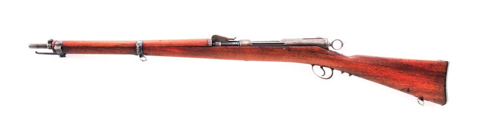 Scarce Swiss Schmidt-Rubin Model 1897 Cadet Single Shot Rifle, #629, 7.5x53.5 Swiss cal., 23.3'' barrel, blue finish, straight grip wood stock, steel buttplate, inverted ''V''-notched front sight, rear sight graduated to 400m on the right and 12000 meters on the left side. Rifle includes a bayonet lug on the underside of the front band; sling swivel on rear band and buttstock. The triggerguard on this rifle is unique as it is finger grooved. Barrel, bolt, and receiver with matching numbers. Small Swiss cross acceptance marks can be found throughout the rifle, including the receiver, bolt, handle, rear sight, bands, etc. Top of buttplate is stamped ''397/(acceptance mark)/8''. Considered quite rare as only approx. 7900 of these rifles were produced. Condition is very good with approx. 65%-70% thinning and toning blue finish. Factory lettering, acceptance marks, etc. are clear. Right side of the rear sight base with an area of concentrated scratching. Wood shows age and wear consistent with the rest of the rifle, including general surface dings and scratches as well as thinning and finish loss. Left rear edge below the receiver with an approx. .5''x4'' wood splice repair; original piece of wood may have been used as the color matches very well. Bolt and trigger pull are smooth; cocking piece functions but is a little weak. Bore is bright and rates near excellent showing light wear. Est.: $600-$900. (Antique)