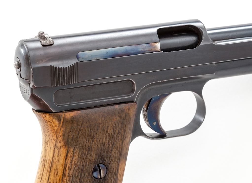 Scarce Mauser Model 1914 Long Barrel Wartime Commercial Semi-Automatic Pistol, #68828, .32 ACP cal., 4.25'' barrel, blue finish, factory checkered walnut grips, with one factory magazine. Condition is fine retaining approx. 94% blue which is mildly toning. Minor losses to finish at muzzle. Grips are fine with only light impressions. Good action, bright bore. Est.: $800-$1,200. (C&R)