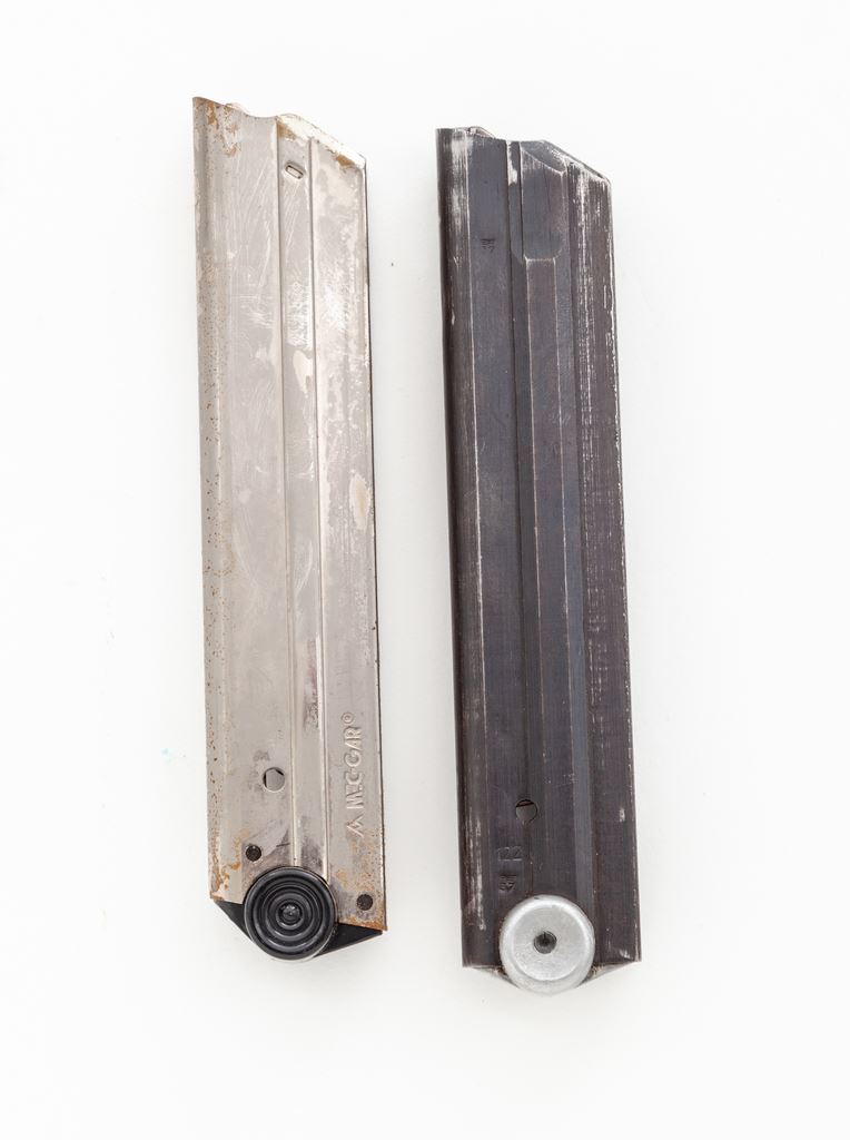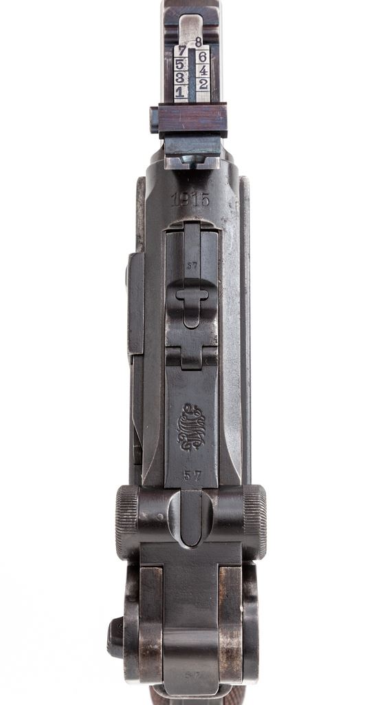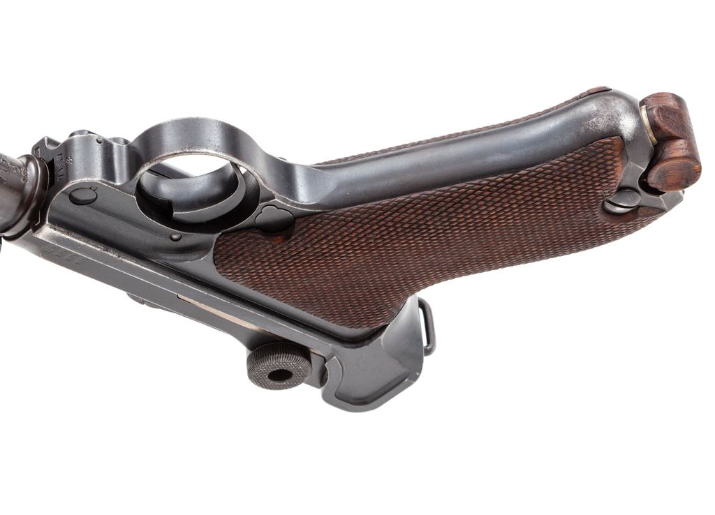 WWI Model 1914 Artillery Luger, by DWM, #7157b, 9mm, 8'' barrel, blue finish, checkered walnut grips, with one WWI era tin-plated unmarked magazine. Chamber area dated 1915, DWM marked toggle, Geischert/Geladen thumb safety and extractor. Pistol includes one reproduction shoulder stock, cartridge block, and two magazines (a modern MEC-GAR and a WWII era blue-bodied with pinned aluminum base example). In modern khaki covered canvas case. Condition of pistol is very good having been refinished at one point, as components that were originally straw finished are now blue and present finish is more of the immersion type. Barrel appears to be of new mfg. and accurately marked to match. Grips with crisp checkering and small loss to left panel just below thumb safety. Good action, mirror bright bore. Est.: $1,500-$2,000. (C&R/PPT)