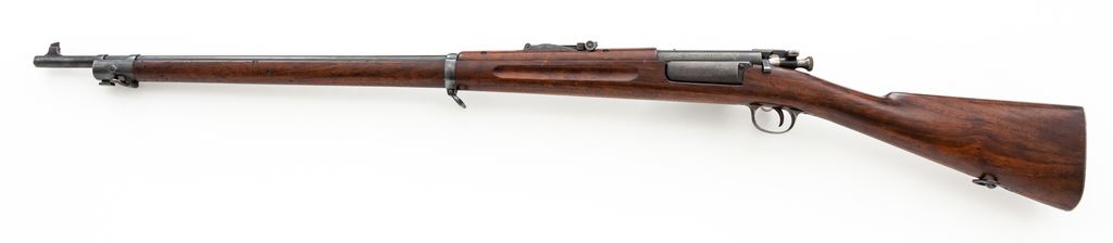 U.S. Model 1898 Krag Bolt Action Rifle, #275770, .30-40 Krag cal., 30'' barrel, blued finish, walnut stock, blade front sight and Model 1902 rear sight. August 1900 production. Marked on left side of receiver ''U.S. MODEL 1898 SPRINGFIELD ARMORY'', and on left side of stock at the wrist with a boxed ''J.S.A. 1900'' cartouche; underside with a tiny stamped ''J.C'' above a circled ''P'' firing proof. Condition overall is about fine with the finish on the receiver toned to a light gray. Barrel and bands retain approx. 90% finish with three small dings on the top of the barrel. Finish on the buttplate is worn bright, now aged to a dull patina. Wood has an even color overall and both cartouches are crisp. There is an approx. half-inch carved letter ''A'' added to the left side of the stock. Condition overall is very good with added finish over stock dents the most noticeable below the stacking swivel and below the rear sight, with overall handling marks. The action and magazine operate smoothly; bright bore is excellent. A nice example of a classic U.S. Army rifle. Est.: $600-$800. (C&R)