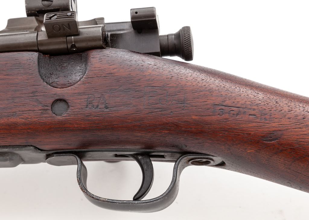 U.S. Model 03-A3 Bolt Action Rifle, by Remington, #4206757, .30-06 cal., 24'' 4-groove barrel (RA/9-43), parkerized finish with blued small parts, straight grip cartouched walnut stock, and U.S. marked front sight cover. (Ref. the book, ''The Model 1903 Springfield and Its Variations'', page 63; and the book, ''Collecting the American Sniper Rifle 1900 to 1945'', page 81, by Joe Poyer.) Condition is excellent. Metal surfaces retain approx. 98% thinning parkerized finish. Stock with mild impressions, with ''RA'' and ''FJA'' cartouches, as well as one reworked cartouche and inventory rack numbers to both top and left side of buttstock. Action is good, bore is bright. Est.: $500-$750. (C&R) (Joe Poyer collection)