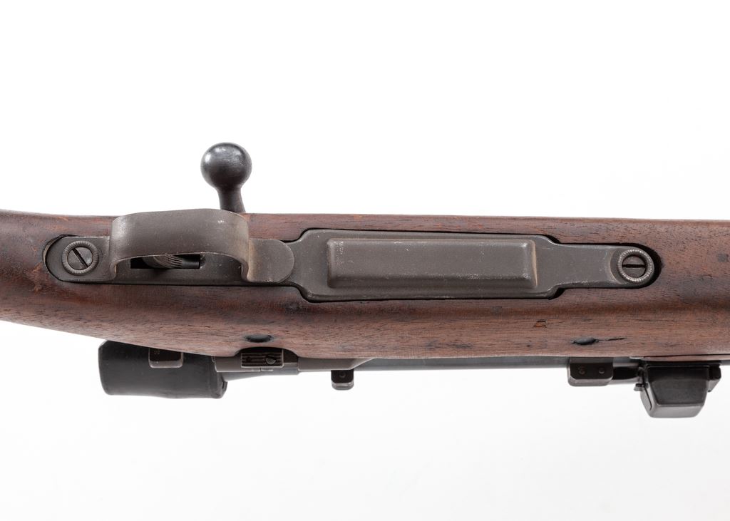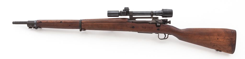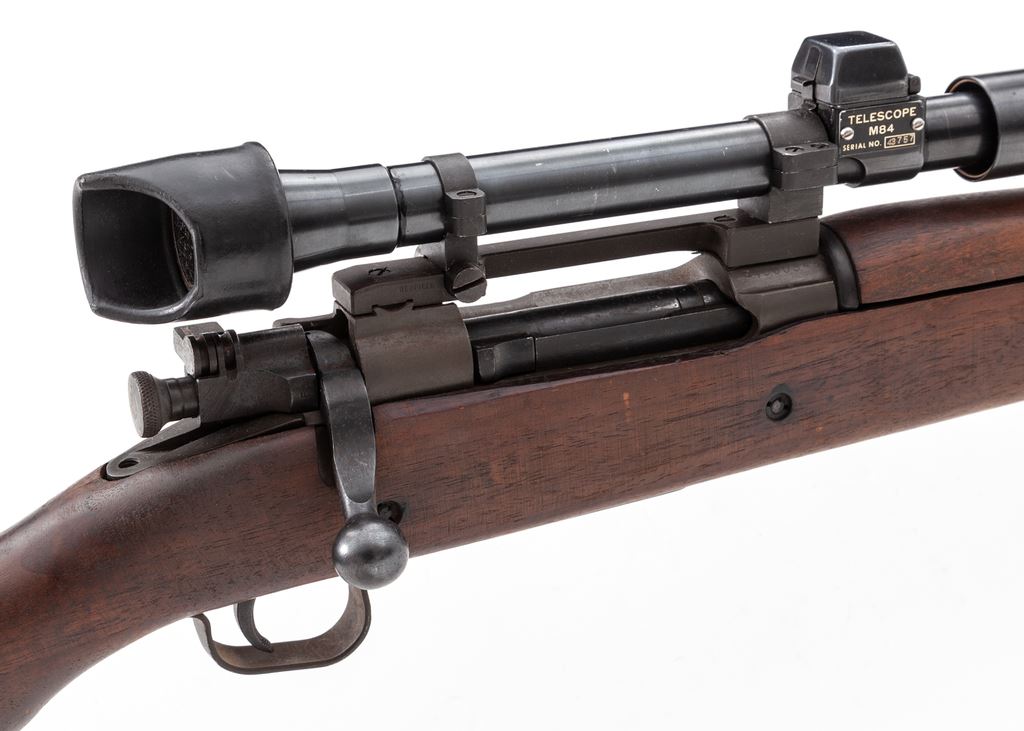 Z-Series Remington Model 03-A4 Bolt Action Sniper Rifle, #Z4000546, .30-06 cal., 24'' barrel dated 9-43, parkerized finish, blue bolt and small parts, walnut scant cut stock and upper handguard. Topped with a M84 telescopic sight on Redfield rings and mounts. Z-Series rifles are quite scarce with less that 3000 mfg'd. (Ref. the book, ''Collecting the American Sniper Rifle 1900 to 1945'', page 70, by Joe Poyer.) Condition is excellent as approx. 97% of the factory parkerized finish is retained. Complete scope with eyepiece and sun shield shows just light wear to high edges. Upper handguard with three arsenal dovetail repairs to forward third. Area of stock near rear tang with small brass nail repairs that detract little. Stock shows no evidence of sanding. Action is good, scope optics are clear, bore is fine. Est.: $3,500-$5,000. (C&R) (Joe Poyer collection)