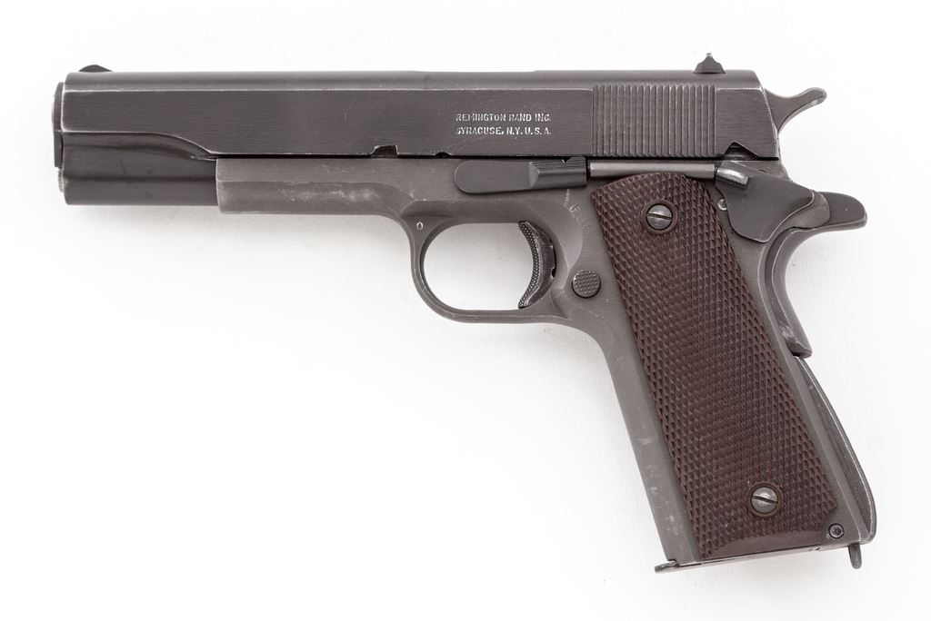 Remington-Rand Model 1911-A1 Semi-Automatic Pistol, #2436887, .45 ACP cal., 5'' Hi-Standard barrel, parkerized finish, brown checkered plastic grips, with one parkerized magazine by General Shaver. (Ref. the book, ''The Model 1911 and Model 1911A1 Military and Commercial Pistols'', photo insert pages & page 49, by Joe Poyer.) Mfg'd 1945. Condition is excellent and may have been arsenal refinished at one point, showing mild evidence of being fitted for target shooting. Top of frame rails are polished, barrel link may be a later replacement, and trigger has been tuned. Slide exhibits a somewhat tighter fit than a standard pistol. Grips show little wear. Crisp action, bright bore. Est.: $1,000-$1,500. (C&R/PPT) (Joe Poyer collection)