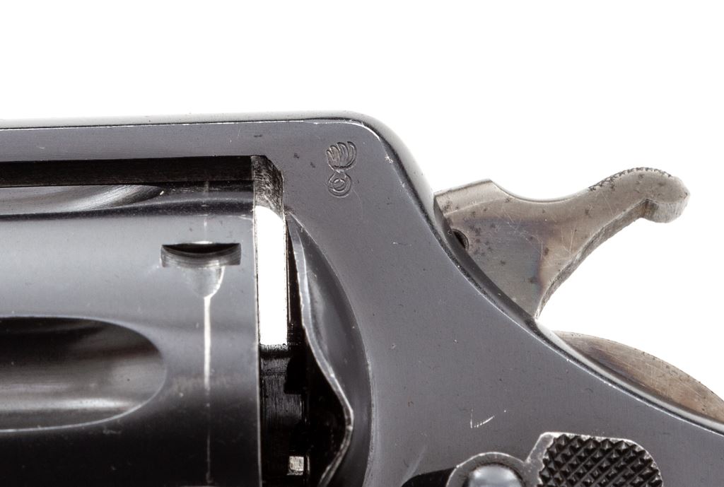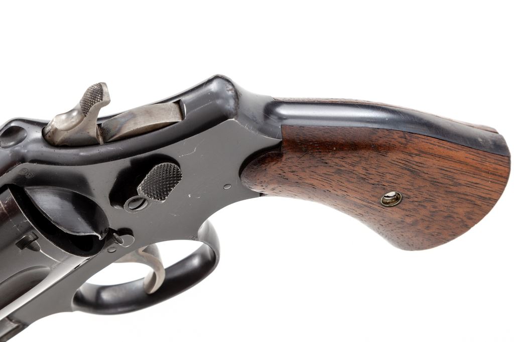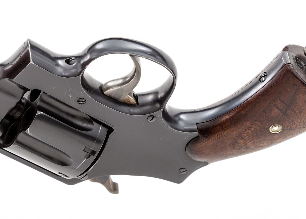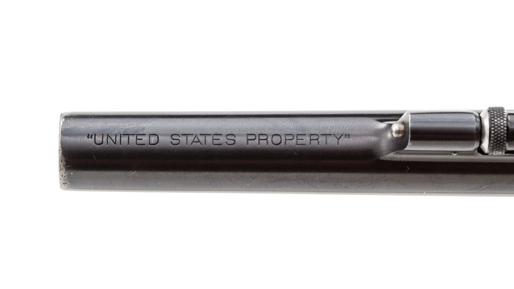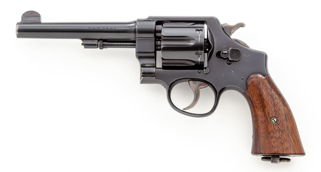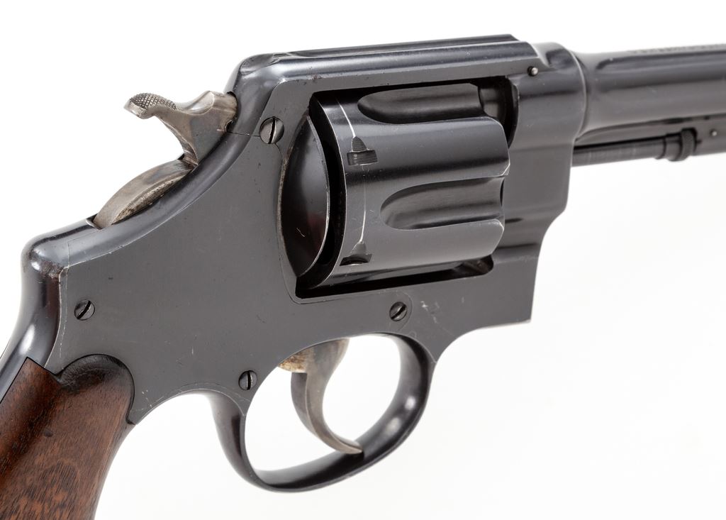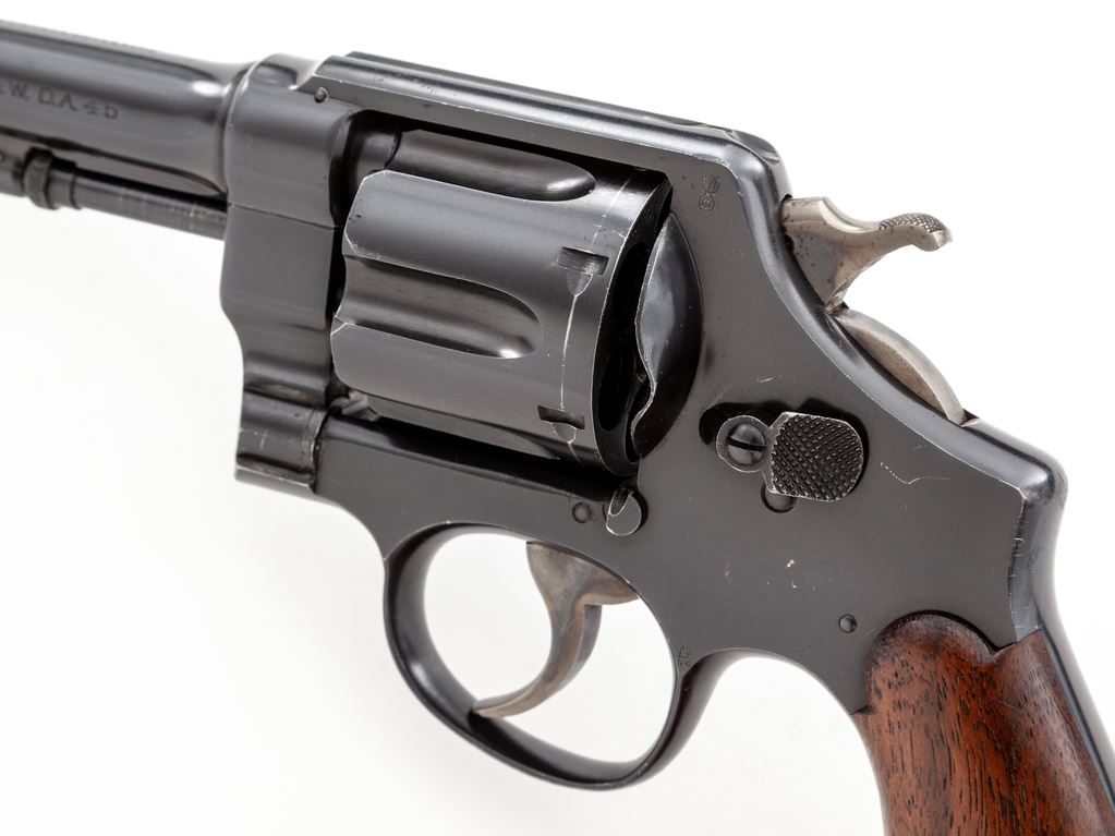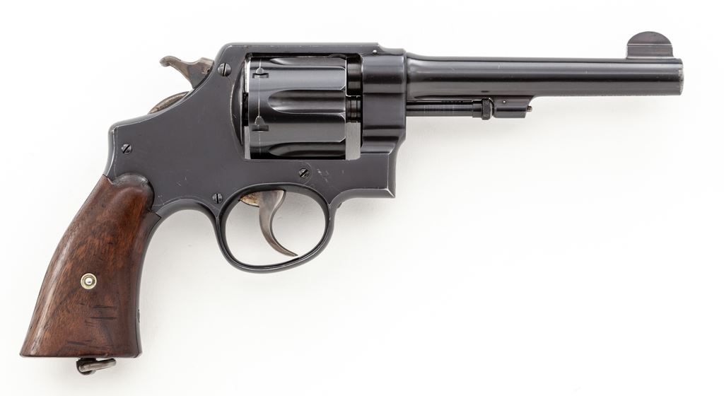 Smith & Wesson Model 1917 Double Action Revolver, #108263, .45 ACP cal., 5.5'' barrel, blue finish, smooth walnut grips with lanyard loop in butt. ''U.S. Property'' marked to bottom of barrel, with flaming bomb to upper left portion of frame. Mfg'd 1917-18. Condition is near excellent retaining approx. 92%-94% original blue, wear at muzzle, forward portion of front sight, high edges, and strong front and back strap. Grips with very light markings. Action is crisp but seems to be filled with old dried grease; bore is mirror bright. Est.: $750-$1,000. (C&R/PPT)(Joe Poyer collection)