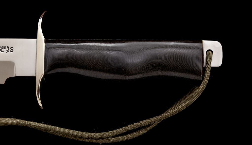 Randall Knives ''Buxton Fighter'' Fixed Blade Knife, numbered BF #077, with sheath. A modified version of a Model 14, designed by authorized Randall knife dealer Wayne Buxton. Knife features a 6.5'' bowie type clip point blade with standard ''Randall Stainless'' logo, 11.75'' overall. ''Border Patrol'' style black micarta handle, curved nickel double hilt, extended tang with green wrist thong. In original Randall sheath, stamped on back with Randall logo and ''BS'', with nickel snaps and stone pouch, ''Fine India-Made In U.S.A. sharpening stone, and green leg wraps. Knife is in excellent overall condition. Blade is as new. Nickel hilt with some minor toning and micro-scratching. Black micarta shows a few slight handling marks. Sheath with a little darkening at the throat and is in otherwise excellent condition. Est.: $400-$600.