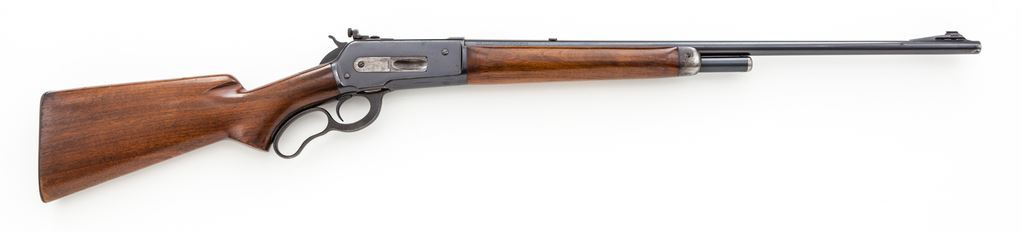 Pre-War Winchester Model 71 Lever Action Rifle, #2497, .348 cal., 24'' barrel, blue finish, pistol-grip walnut stock and forend, standard front, dovetail block rear and factory bolt peep sight, with checkered blue steel buttplate. This 2nd year of production example with early features such as long upper tang. Mfg'd 1936. Condition is very good retaining approx. 85% original blue. Stock with minor scratches and losses to varnish near toe. Front sight hood has been removed. Action is crisp, bore is fine. Est.: $1,000-$1,500. (C&R)