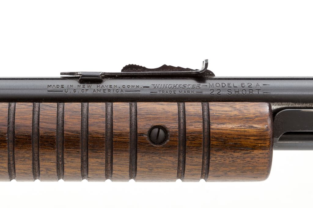 Winchester Model 62A Pump Action Rifle, #229598, .22 Short cal., 23'' barrel, blue finish, walnut stock, 17-groove large forend, with standard gold bead front sight. Mfg'd 1948. Condition is excellent. Metal surfaces show light small scuffs from handling with approx. 97% blue remaining. Stock with only the lightest impressions. Good action, bright bore. Est.: $800-$1,200. (C&R)