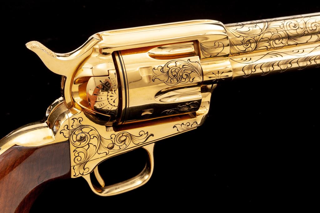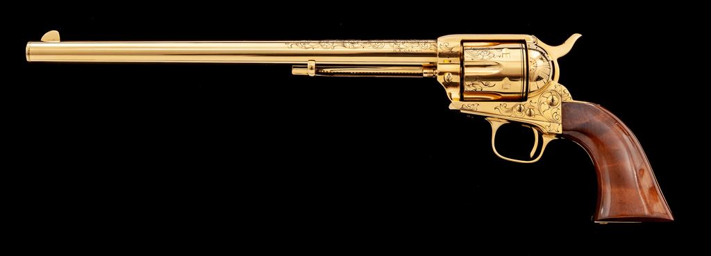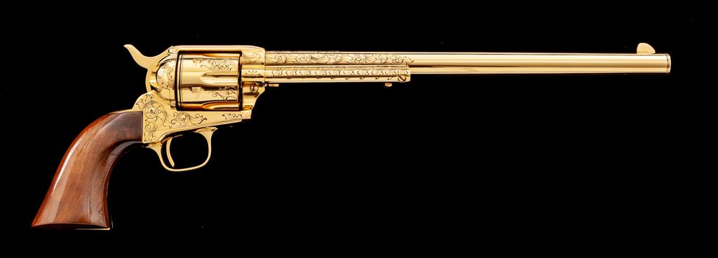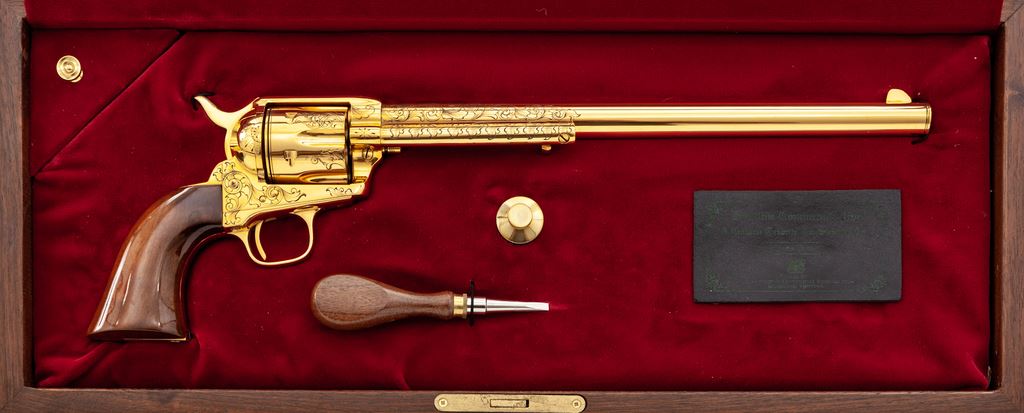 24k Gold-Plated & Engraved American Historical Foundation Samuel Colt Golden Tribute Buntline Revolver, mfg'd by Uberti, #80020, and numbered on butt 027 of 950. Caliber is .45 LC with a 12'' barrel, 24k gold plating, with hand engraving to portions of the frame, cylinder, ejector rod housing, and barrel. Backstrap is marked ''Col. Samuel Colt'' in script. Revolver also features gloss-finished smooth walnut grips. In walnut display case with glass lid, maroon velvet interior, plaque, and display case key. Also included is a brass oiler, wood-handled screwdriver, hang tags, certificate of authenticity, brochure, original shipping box, and several other pieces of factory paperwork. In excellent unfired condition. 24k gold surfaces with some very minor scattered micro-scratching from handling. Display case is also excellent with a few small marks from storage. Est.: $1,000-$1,500. (Modern/PPT)