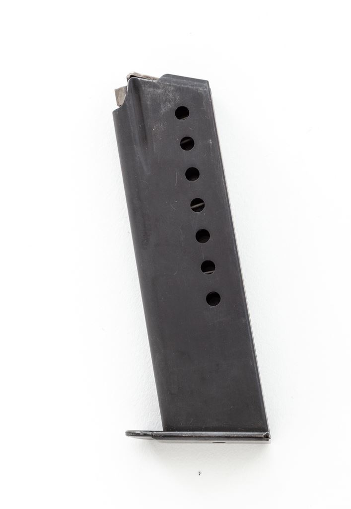 Danish Police/Military Contract Sig Model P210-DK M/49 Semi-Automatic Pistol, #2569, 9mm cal., 4.75'' barrel, parkerized finish, grooved wood grips, bottom magazine release, fixed sights, lanyard loop, with two (2) magazines. Frame, barrel, and slide with visible matching numbers. Left side of frame is marked with a ''(Danish Crown) / HTK''. Condition is excellent with nearly all of the parkerized finish intact. Front edges of the slide with a handful of small nicks and flat spots. All factory marks are clear. Grips also rate excellent showing only a few minor marks from handling. Action is smooth, bore is bright. Box edges show light wear. Est.: $1,800-$2,400. (C& R/PPT)