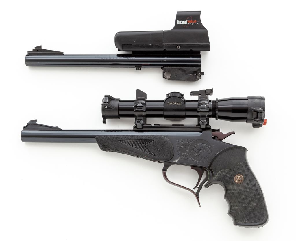 Thompson Center Arms Contender Single Shot Pistol, with Leupold scope and extra barrel with Bushnell Holo Sight, #261512, .44 mag. cal., 10'' barrel, blue finish, checkered black rubber Pachmayr grip, checkered wood forend that has had an added black textured finish, and fixed blade front sight. The barrel that is currently on the pistol is topped with a Leupold M8-2X extended eye relief scope and Millett mount; scope with a duplex reticle. Top of the front Millett scope ring with an integral red ramp front sight; rear ring with a standard Contender rear sight dovetailed into the top. Included with this pistol is an additional walnut forend, Bianchi ''Ranger'' holster, and an additional Thompson 10'' barrel in .22 WMR caliber; barrel is topped with a Bushnell ''Holo'' sight. Condition is fine overall with approx. 97% original blue. Barrel shows intermittent slight scratches from handling. Forend with a spot of finish loss along the inside edge from opening and closing the action. Pachmayr grip shows some flattening to the checks. Action and bore are both excellent. Scope optics are bright and clear. The additional barrel retains approx. 99% original finish showing just light handling marks; bore is excellent. Est.: $500-$700. (Modern/PPT) (Paul Hantke collection)