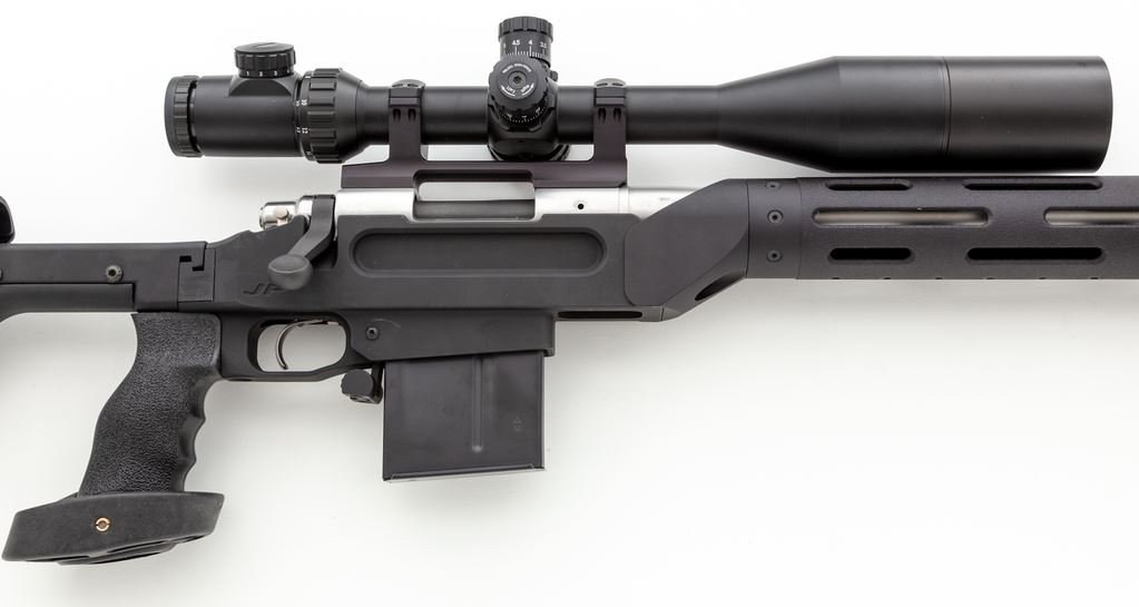 Remington Model 700 5-R Bolt Action Rifle, with JP Chassis, #RR27953C, .308 cal., 24'' heavy barrel, satin stainless finish, JP Enterprises matte black aluminum chassis with full palm shelf pistol grip; providing a free floating barrel and external box magazine. The Magpul PRS stock with adjustable length of pull and cheekpiece height. Rifle also features sling swivels, ambidextrous magazine release, and UTG Bi-pod. Topped with a Millett Tactical TRS-1 4-16x50mm scope with Mil-DotBar reticle with green illumination, sun shade, and matte finish. Mount is a Nightforce 20 MOA. Included is the factory box with matching end label and original black with green accent synthetic stock. In excellent near new overall condition. Matte surfaces with a few minor scuffs from handling. Action is smooth with an excellent bright bore. Scope optics are bright and clear; green illumination works properly. Est.: $1,600-$2,200. (Modern)