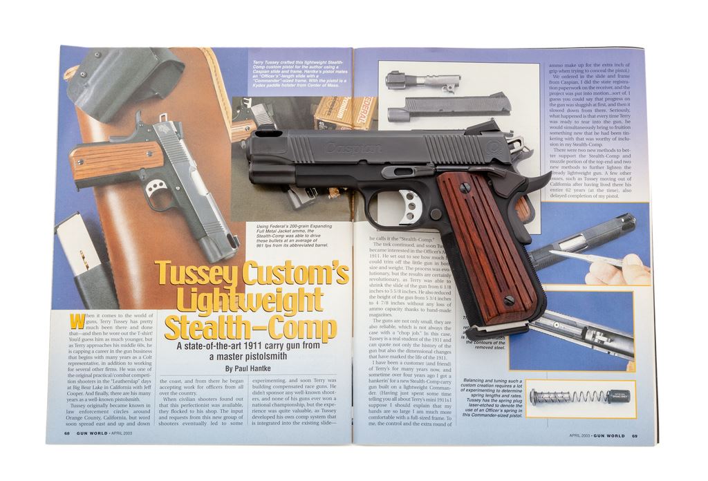 Tussey Custom Stealth-Comp 1911 Semi-Automatic Pistol, #PH42950, in .45 ACP cal. This pistol was built using a Caspian ''Officer's'' length slide and Caspian ''Commander'' sized frame, and 4.25'' compensated Kart National Match barrel. Frame is matte black with the slide also having a matte finish but being a lighter gray in color. Pistol also features a lightweight skeletonized hammer and trigger, fixed front sight with tritium insert, Trijicon rear sight with tritium dot in base, custom rosewood grips, checkered front and back grip strap, and includes one Wilson Combat magazine. This pistol was featured in the April 2003 Gun World magazine, in an article by Paul Hantke, entitled ''Tussey Custom's Lightweight Stealth-Comp'', pages 68-73. The original Gun World magazine is included. This unique pistol rates as excellent and shows only light scuffs and small handling marks to the matte surfaces. Grips appear near new. Action is smooth with a mirror bright bore. Est.: $1,800-$2,400. (Modern/PPT) (Paul Hantke collection)