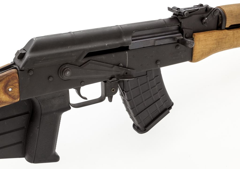 Romanian Romarm/Cugir WASR-10 Semi-Automatic Rifle, #1-93501-11RO, 7.62x39mm cal., 16.5'' barrel, parkerized finish, hardwood stock, sling swivels, Tapco USA trigger, post front sight with protective ears and adjustable tangent rear sight with side rail scope mount. With an aftermarket kydex featureless Aim Sports grip. Included is one plastic bodied 10-round magazine, brown cardboard box with matching end label, original pistol grip, and cable lock. Condition overall is near excellent showing light wear to the highpoints and matte surfaces. Wood is also excellent. Action is smooth, bore is bright. Import stamped on right side of receiver. Est.: $600-$900. (Modern)