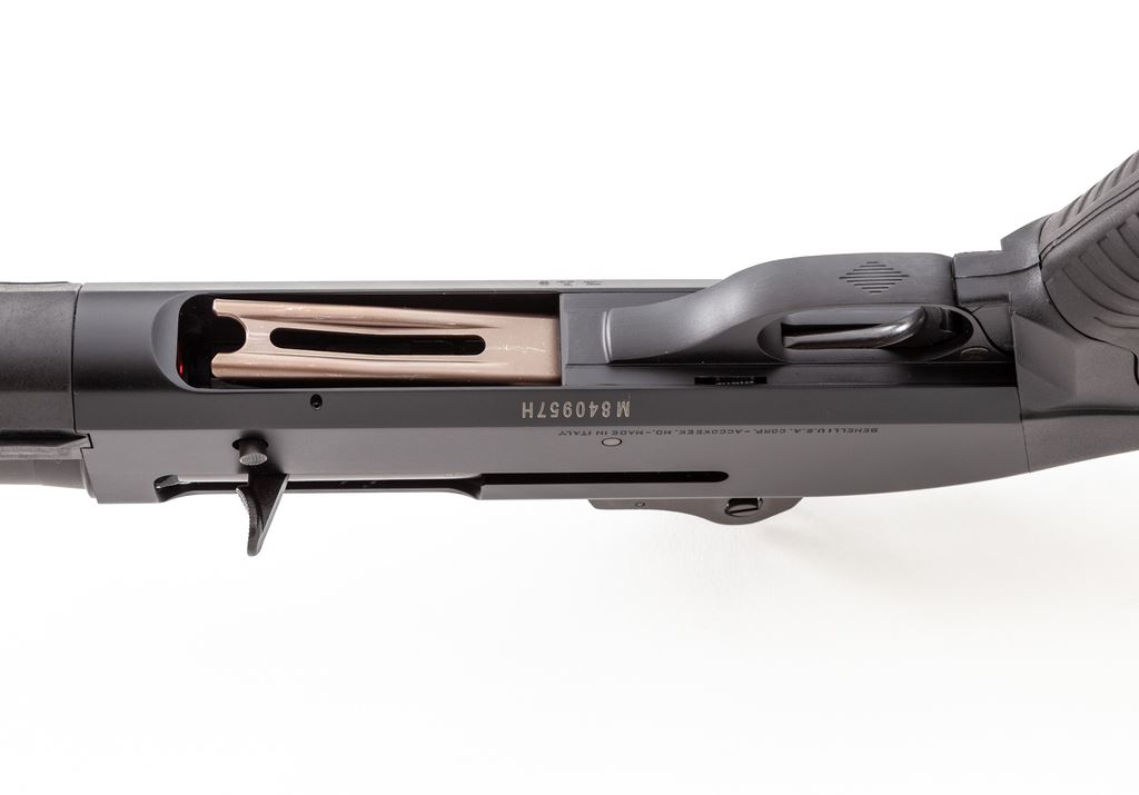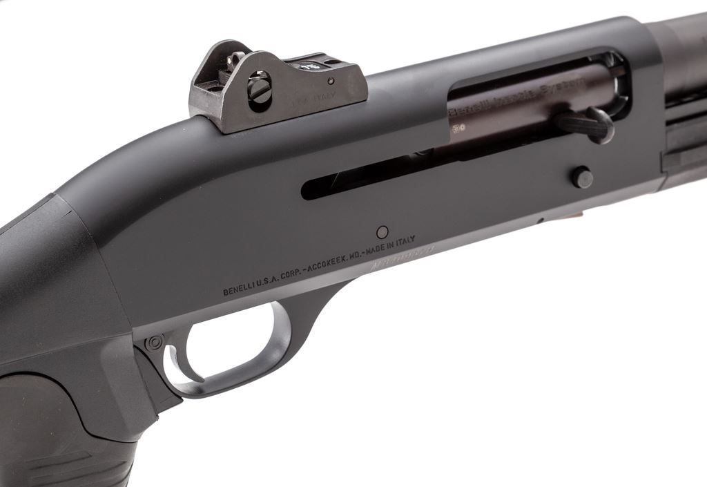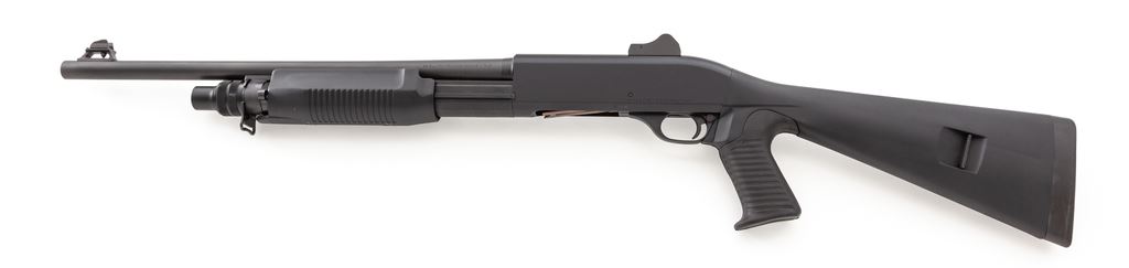 Benelli Super 90 Model M3 Auto/Pump Action Tactical Shotgun, #M840957H, 12 ga. 19.75'' barrel has 3'' chamber and ghost ring sights. Action is either Inertia system semi-auto or slide action; magazine is 5-shot; receiver and barrel are finished black anti-glare, buttstock and forestock are black polymer. Mfg'd approx. 1990s. Condition is excellent, showing no mars to exterior and virtually no wear to action; bore is mirror bright. Est.: $900-$1,100. (Modern)