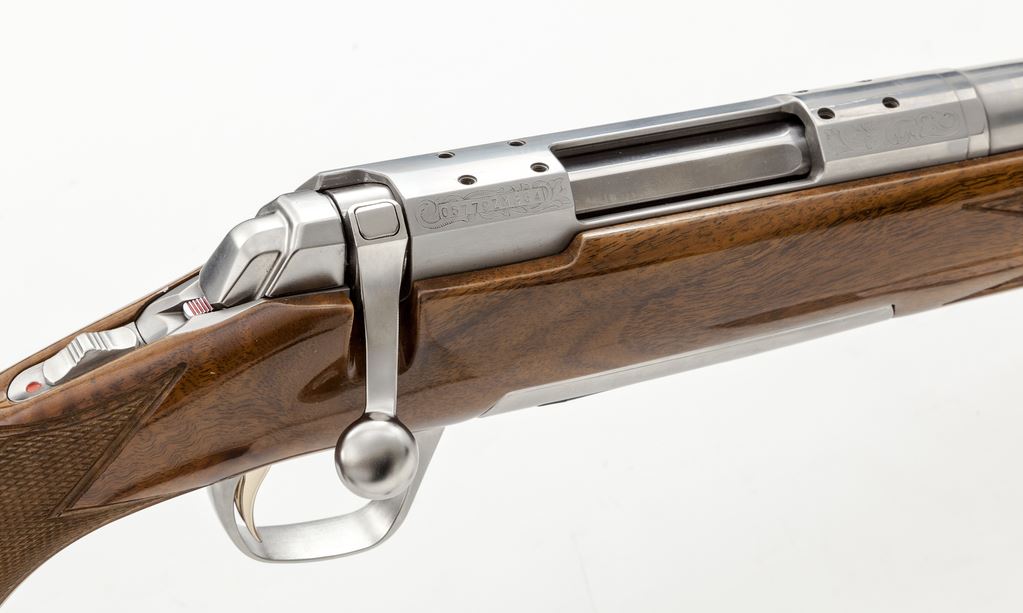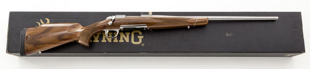 Browning X-Bolt White Gold Medallion Bolt Action Rifle, #05779ZM354, .243 cal., 22'' barrel, stainless steel, with scroll engraving on the receiver; left side reads ''WHITE GOLD MEDALLION'' in gold lettering; top of receiver is factory drilled and tapped for scope mounts. The gloss-finished high grade walnut stock with cheekpiece, checkering at the forend and pistol grip, black rubber ''Inflex Technology'' recoil pad, stainless sling swivel studs, rosewood grip and forend cap. With four (4) hard plastic 3-shot detachable magazines. In original box with matching end label, gun lock, owner's manual, and scope rings. Rifle is in excellent near new overall condition. Top of receiver with slight scope base marks, otherwise showing only a few minimal handling marks. Action is smooth, bore appears like new. Est.: $800-$1,200. (Modern)