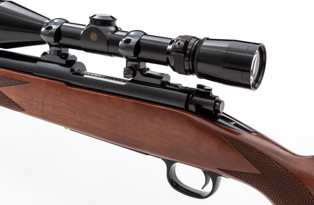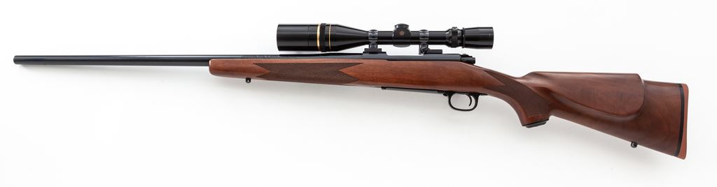 Winchester Model 70 Varmint Bolt Action Rifle, with Leupold scope, #G1957044, .243 cal., 26'' barrel, blue finish, oil finished checkered pistol-grip walnut stock with cheekpiece, red rubber Winchester recoil pad, grip cap, and sling swivel studs. Rifle comes from the factory without sights and is topped with a Leupold Vari-X III 4.5-14 scope with front sunshade and a duplex reticle. Only a few minor handling marks can be found on the wood, and this rifle is in near new overall condition. Bolt jewelling shows some wear. Action is smooth with an excellent bore. Scope optics are bright and clear. Est.: $600-$900. (Modern)