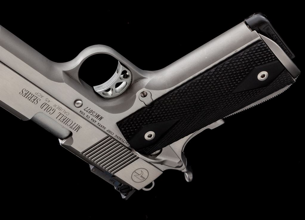 Mitchell's Mausers Gold Series 1911 Semi-Automatic Pistol, #MMC5077, .45 ACP cal., 5'' barrel, stainless steel, slide with front and rear slide serrations, checkered double diamond dark wood grips, red dot front sight, fully adjustable Champion rear sight, ambidextrous thumb safety, lightweight hammer and trigger, with one Wilson Combat magazine. In original box with matching end label and owner's manual. Mfg'd by Dan Wesson. Both sides of the slide behind the rear serrations and top of barrel at the chamber with the Dan Wesson logo. Pistol rates as excellent overall. Metal shows a few minor light scratches and handling marks. Grips appear as new. Action and bright shiny bore are both excellent. Est.: $750-$1,000. (Modern/PPT)