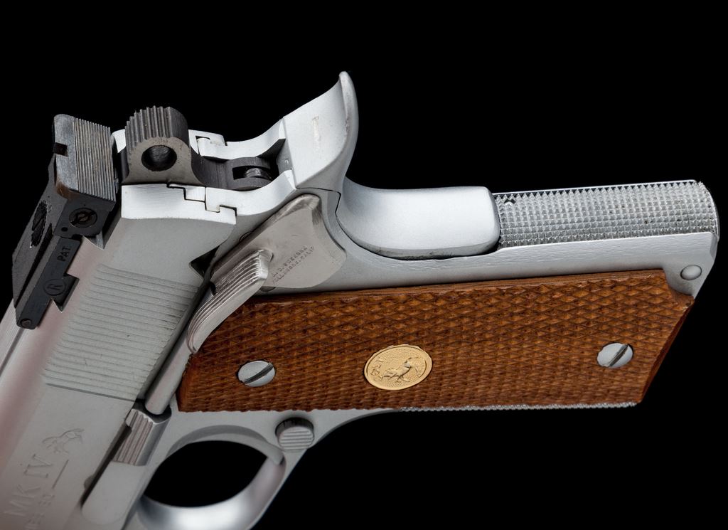 Colt Officer's Model Semi-Automatic Pistol, #FA04761, .45 ACP cal., 3.5'' original barrel and 4.5'' compensated barrel included, hard chrome finish (originally blue), factory checkered walnut grips with gold medallions, Bomar adjustable rear sight with ambidextrous thumb safety, checkered front strap and mainspring housing. In original Colt woodgrain box with matching end label. Dating to late 1980s. Condition is excellent as modified, with slick action and trigger. A nice $1,000 gun with at least $1,000 in upgrades. Est.: $1,200-$1,800. (Modern/PPT)