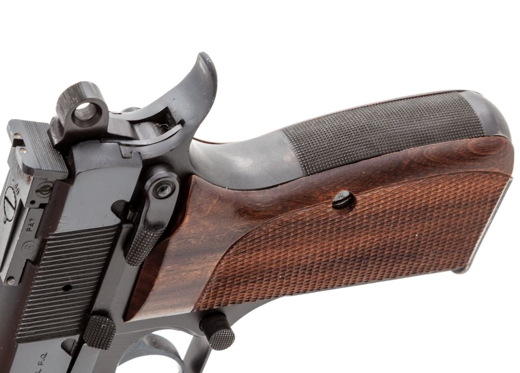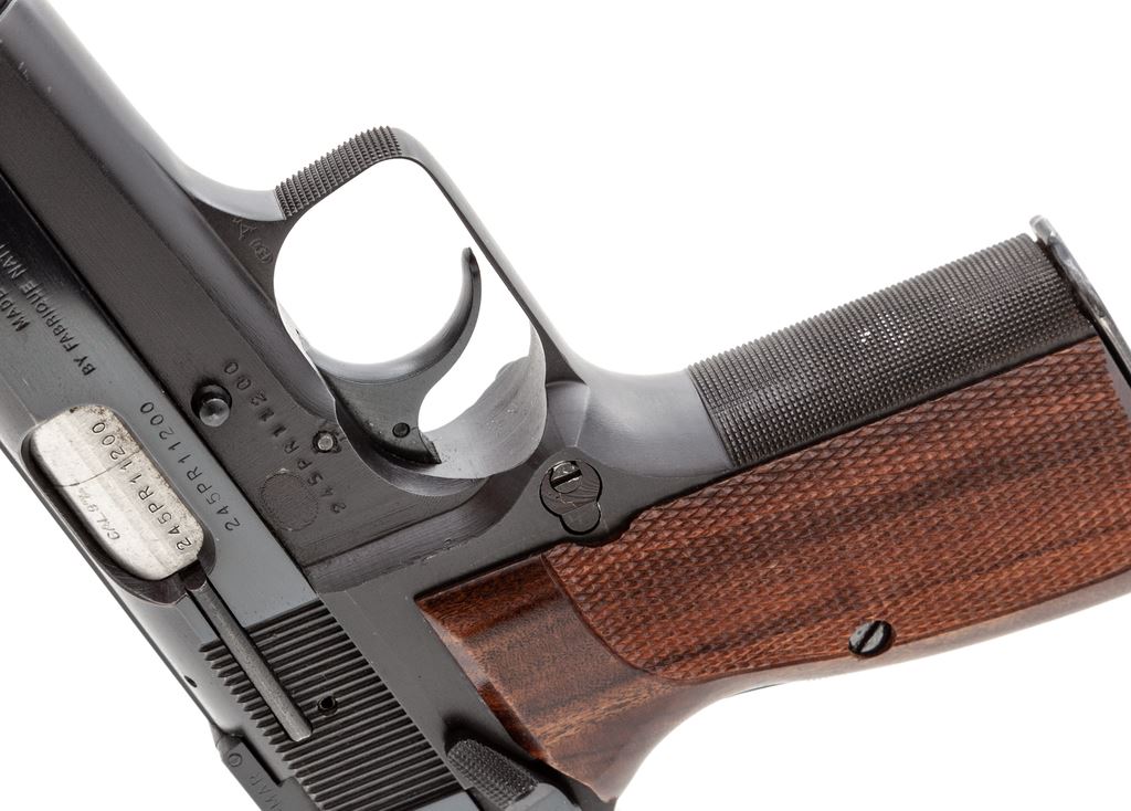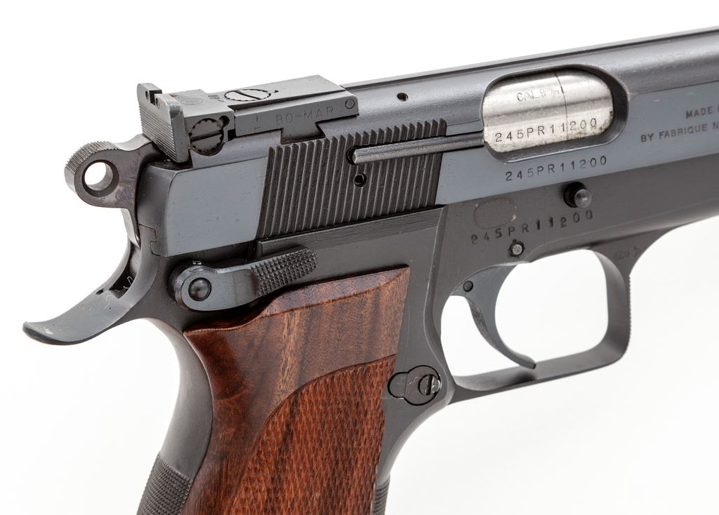 Customized Browning Hi-Power Semi-Automatic Pistol, #245PR11200, 9mm, 4.75'' barrel, blue finish, custom checkered walnut grips, Bomar rear and custom front sights, checkered front and back strap, special fitted barrel bushing, custom milled slide top with thin sighting plane, extended slide release, with one Italian mfg'd high capacity magazine. Condition is excellent as modified with only the lightest marks in actioning areas of trigger, hammer, and muzzle portion of slide. Est.: $800-$1,200. (Modern/PPT) (High cap mags not available to Calif. residents.)
