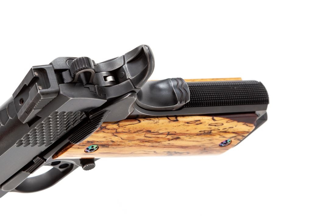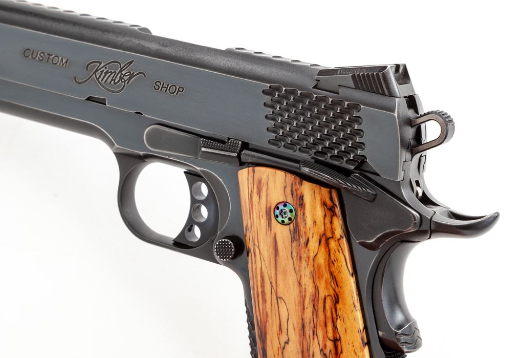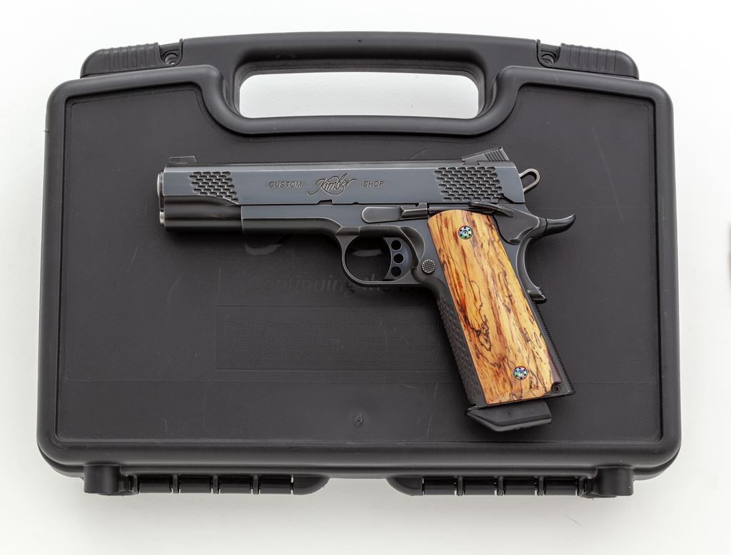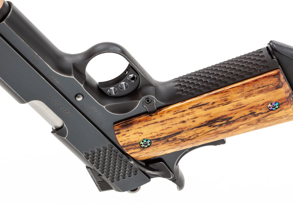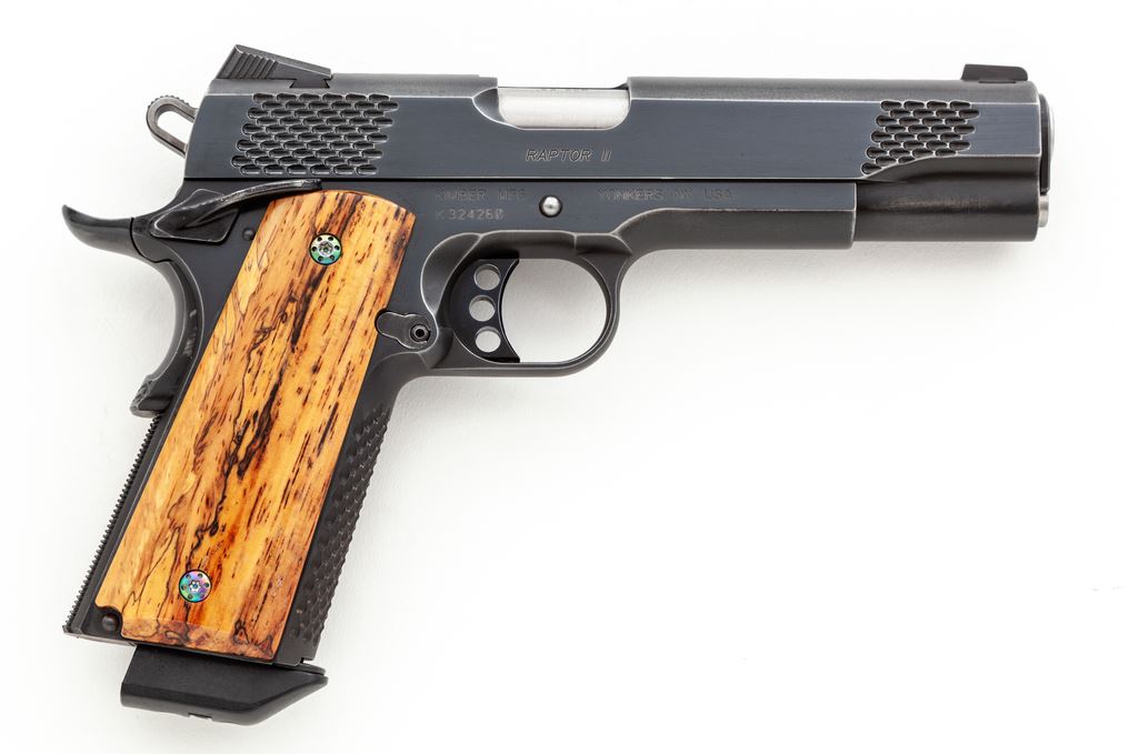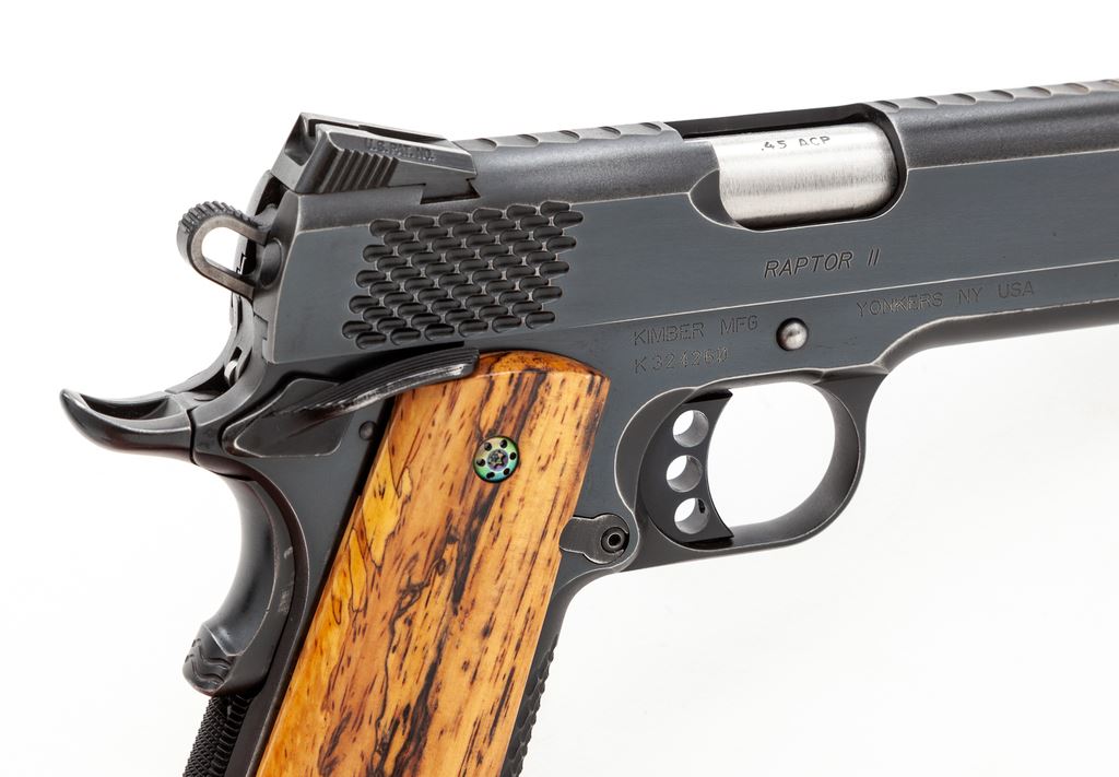Kimber Raptor II Semi-Automatic Pistol, #K324260, .45 ACP cal., 5'' barrel, blue finish, lightweight hammer and trigger with 3-dot night sights, and an ambidextrous safety. Pistol has been fitted with a pair of smooth exotic wood grips with anodized screws; original scaled wood grips are also included. Slide and front grip strap with scaled serrations. In original black plastic case with matching end label, one magazine, owner's manual, bushing wrench, and other misc. factory paperwork. Left side of slide is marked ''Custom Kimber Shop''. Approx. 95% factory blue remains and the metal surfaces rate as fine; wear to the highpoints accounts for a majority of the finish loss. The aftermarket and factory grips both appear as new. Action and bright shiny bore are both excellent. Est.: $800-$1,200. (Modern/PPT)
