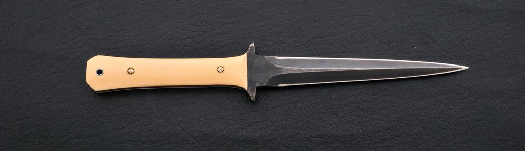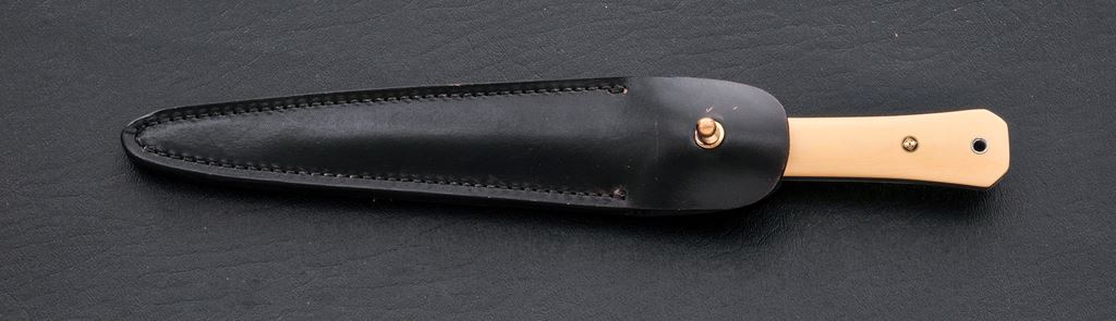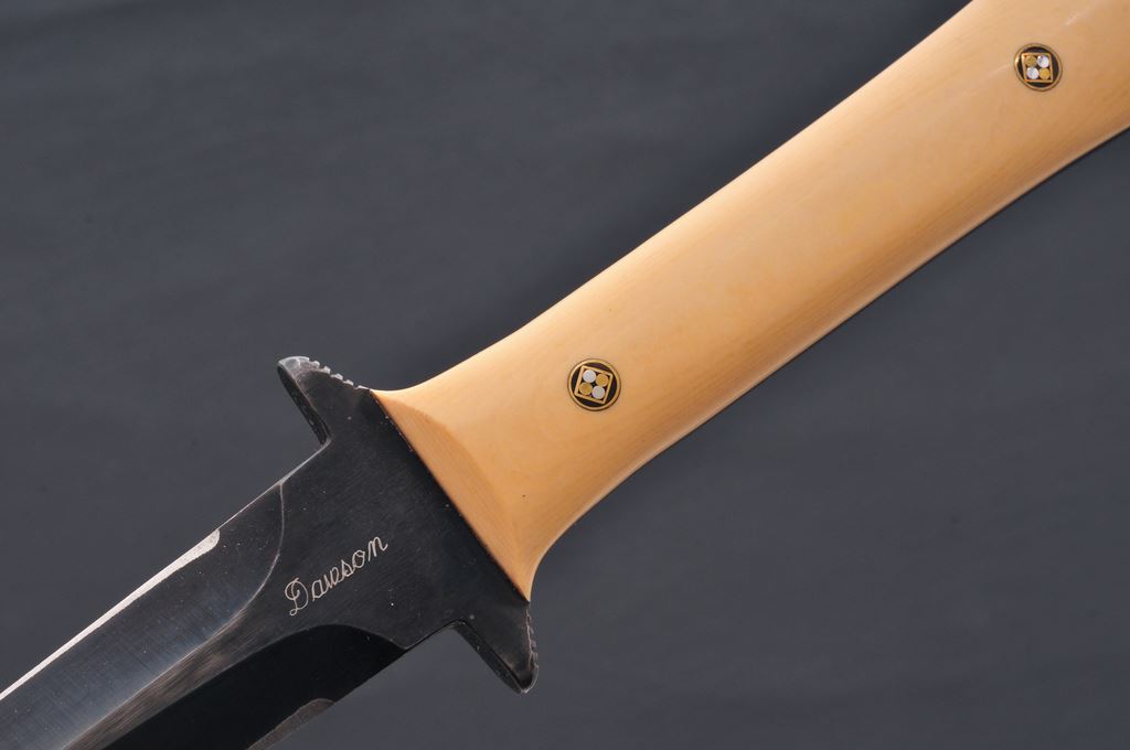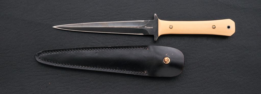 Custom Barry Dawson Dagger/Fighting Knife, with sheath, 7.25'' blade marked ''Dawson'' in script, 12.5'' overall length, crÅ me colored micarta handle with two (2) mosaic pins on each side and a silver ferrule. In unmarked black leather sheath with brass post to the backside. In excellent overall condition. Blade with some moderate sheath wear to the highpoints. Edges are clean and sharp. Grips are also excellent. Sheath appears as new. Est.: $200-$300.