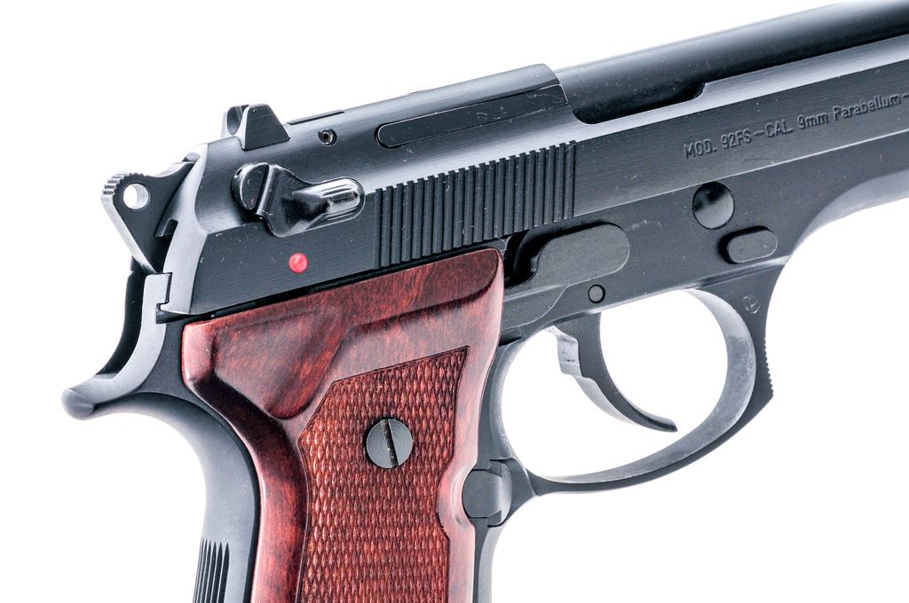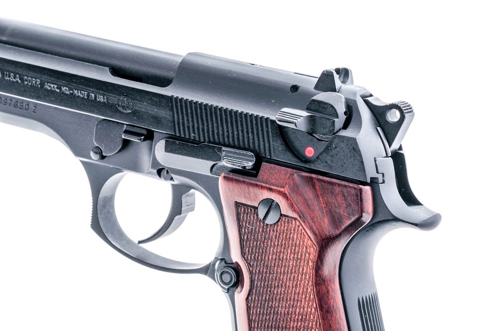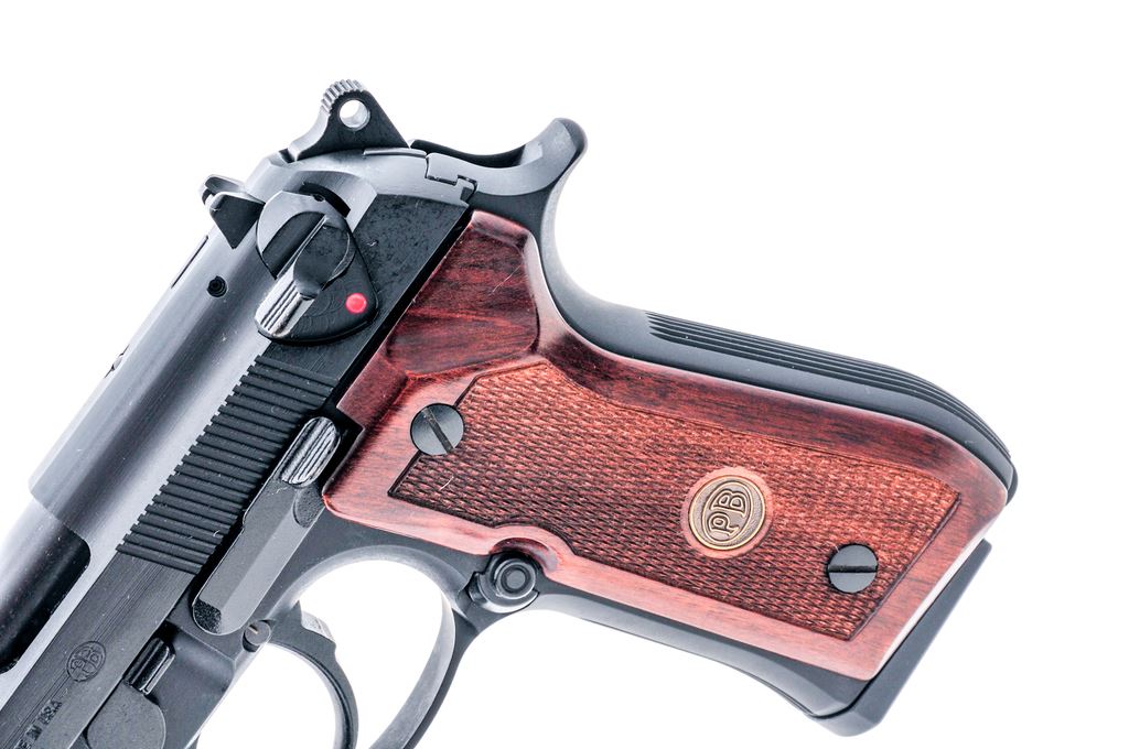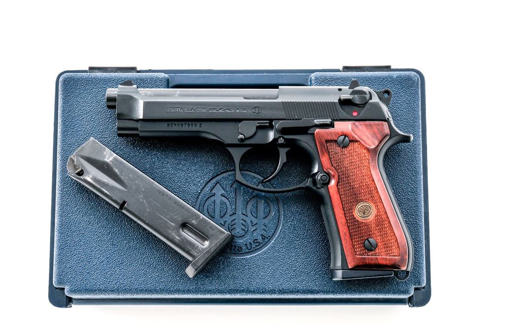 Beretta Model 92FS Semi-Automatic Pistol, #BER097850, 9mm, 4.9'' barrel, black finish, checkered wood grips with gold Beretta medallions, white-dot front sight, notched rear sight with white post, ambidextrous safety/decocking lever, with two (2) factory 15-round magazines. In factory plastic case (no end label) with the owner's manual. Condition is excellent with approx. 99% factory black finish. Overall this pistol shows a few normal small handling marks and signs of only light use. Grips screws with a small reveal around the edges. Action is like new with a mirror bright bore. Est.: $350-$550. (Modern) (Not available to Calif. residents.)