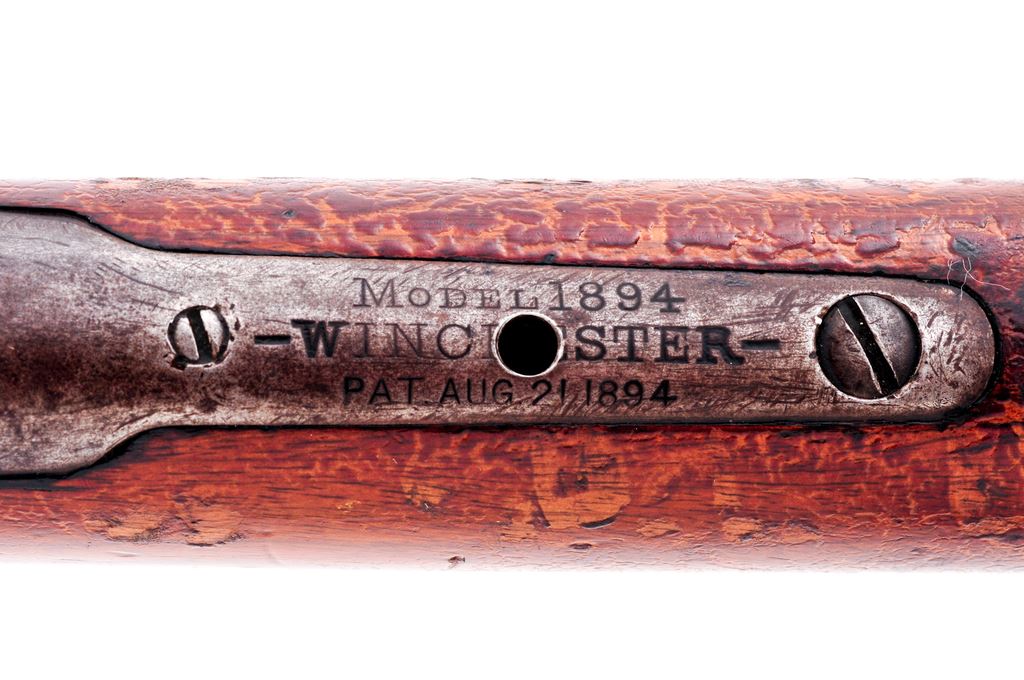 Winchester Model 1894 Lever Action Rifle, #217907, .30 WCF cal., 26'' octagon ''nickel steel'' barrel, blue finish, straight grip walnut stock, with crescent steel buttplate. Rifle also features a large blade front sight and flat top rear sight, both by Marbles. Upper tang with an additional threaded hole in the middle of the stamp which reads in three lines ''MODEL 1894 / -WINCHESTER- / PAT. AUG. 21. 1894''. The two-line ''NEW HAVEN, CONN.'' barrel address is marked on the right side near the breach; left with ''-MODEL 94-WINCHESTER-NICKEL STEEL-30 W.C.F.- / -TRADE MARK-''. Mfg'd in 1901. Rifle is in fair overall condition. Barrel retains a majority of the blue finish with general spotted surface rust, the remaining metal surfaces either silvery gray or brown in color. Magazine tube, forend cap, lever, and buttplate with areas of a little heavier surface rust and some pitting. Barrel address, etc. are clear. Wood shows age and wear consistent with the rest of the rifle; buttstock with blistering to the finish. Action is crisp with a really nice bore. Est.: $700-$1,000. (C&R)