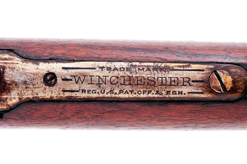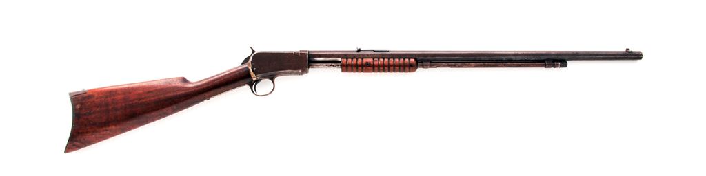 Third Model Winchester 1890 Pump Action Rifle in .22 LR., #630239, 24'' octagon barrel, no finish, straight grip walnut stock and 12-groove forend, crescent steel buttplate, dovetailed blade front sight, and ''V''-notched rear sight with 1901 patent date with adjustment screw. Top of barrel and frame are Winchester proofed. Caliber is marked as ''22 LONG R.'' Mfg'd 1919. Condition is fair with a mostly brown patina. Metal with some freckling and scattered small spots of fine pitting; barrel address, tang stamp, etc. are clear. Wood shows age and wear consistent with the rest of the rifle. Forend with some surface dents; buttstock with a moderate chip to the upper left corner at the wrist. Buttstock also with an added coat of varnish, a small amount of which has run onto the adjoining metal surfaces. Good action; dark bore with spots of surface erosion. Est.: $300-$500. (C&R)