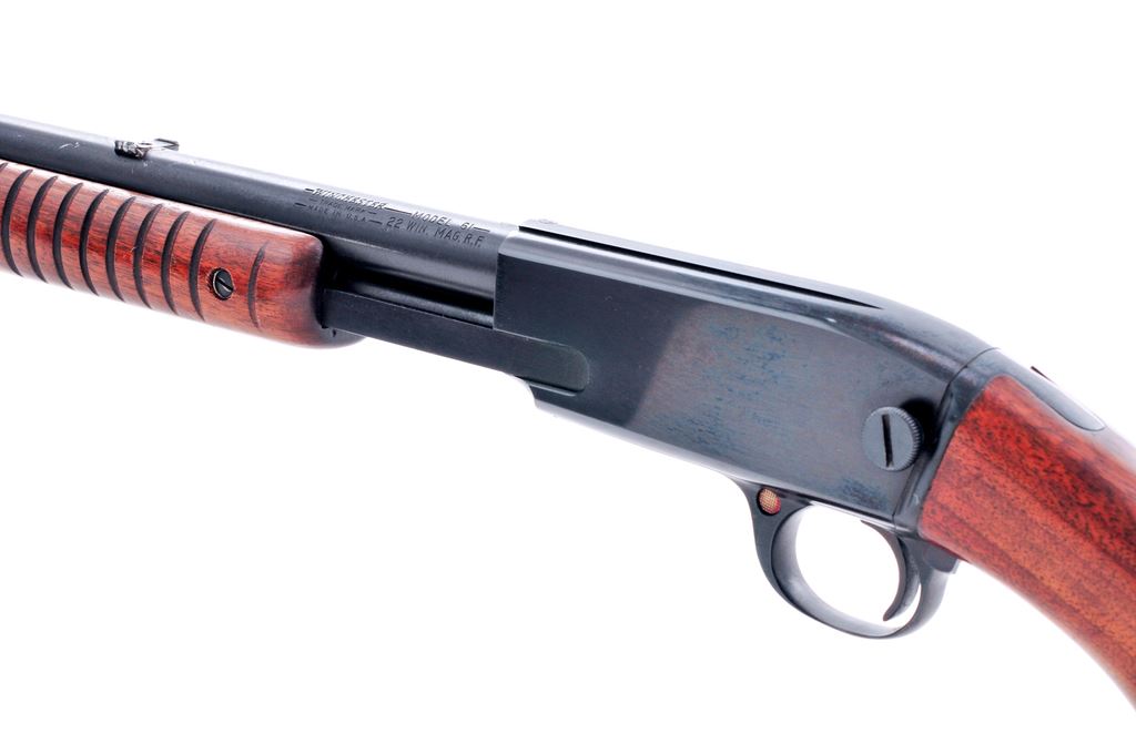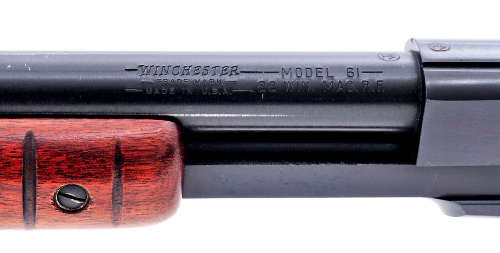 Winchester Model 61 Pump Action Rifle, #291822, .22 mag. cal., 24'' barrel, blue finish, walnut stock, 17-groove forend, hard rubber buttplate, with gold bead front sight. Factory grooved for Weaver type scope mounts. Mfg'd 1958. Condition is fine to near excellent retaining approx. 96% lightly thinning factory blue. Rear sight has been removed and needs to be replaced; small area of finish loss just behind rear sight position. Stocks are excellent with light marks from handling. Good action, bright bore. Est.: $750-$1,000. (C&R)