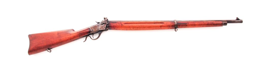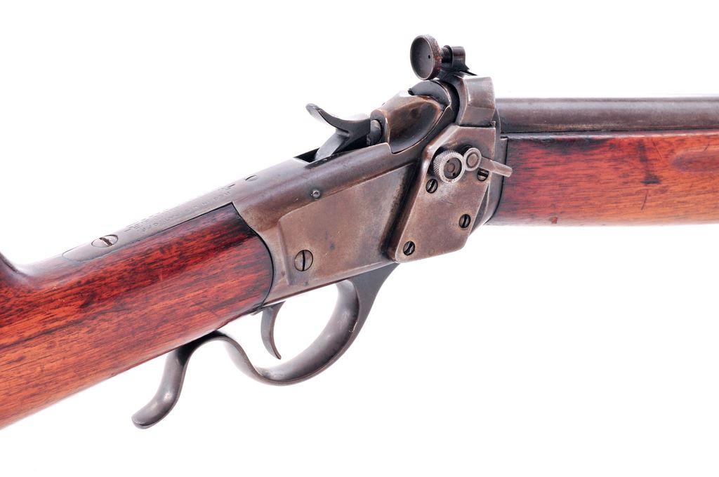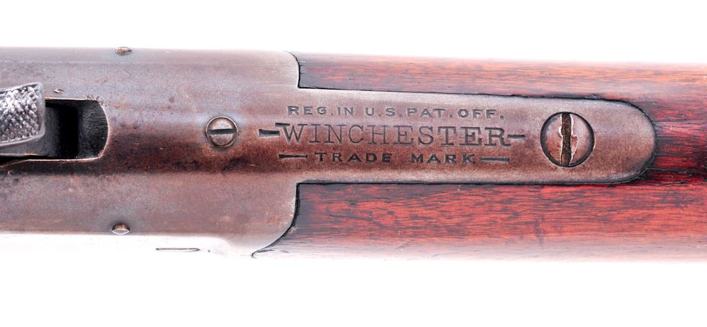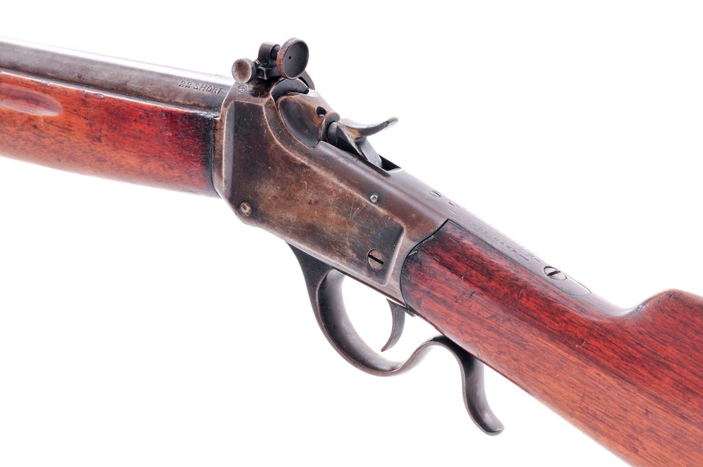 Winder Single Shot Musket, by Winchester, #122187, .22 Short cal., 28'' barrel, blue finish, factory installed Lyman rear sight and Patridge type front sight. Mfg'd 1919. Condition is very good retaining approx. 60% thinning and toning blue. Stock is good with moderate wear, dings and impressions, and lateral fissures through most of the buttstock that appear stable. Rear sight may need work as it appears slightly loose. Good action, bright bore. Est.: $500-$750. (C&R)