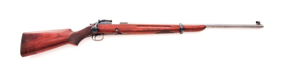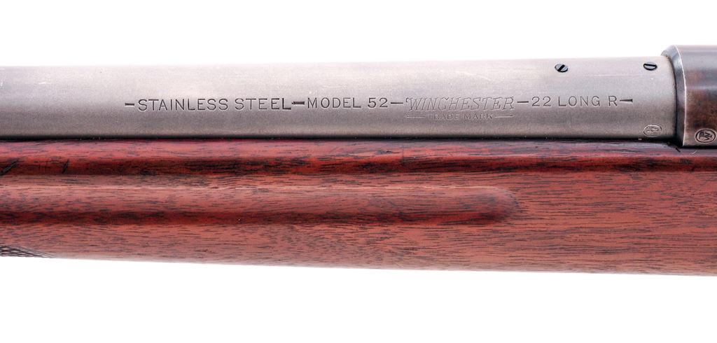 Winchester Model 52 Bolt Action Target Rifle, #14753, .22 LR cal., 28'' factory stainless steel barrel, blue frame and triggerguard, coarse checkered walnut stock, checkered steel buttplate, with standard rear and Winchester globe front sight. Mfg'd 1929. Condition is very good as modified. Frame with approx. 60% blue. Four additional holes threaded and tapped to left side of frame. Rubber ball added to bolt handle for ease of manipulation. Stock is fine with only light marks. Rear sling swivel slot has been filled with red leather, which can easily be removed. Smooth action, crisp trigger, mirror bright bore. Est.: $600-$800. (C&R)