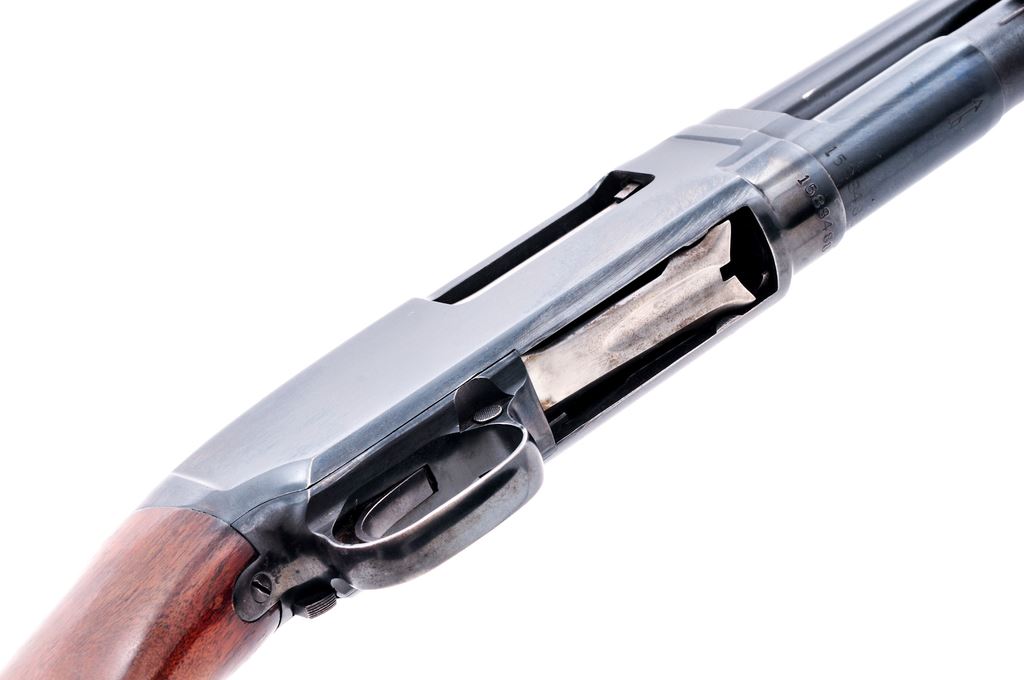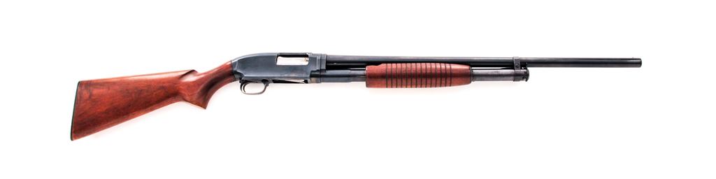 Winchester Model 12 Field Grade Slide-Action Shotgun, #1588488, 12 ga. 26'' plain barrel has 2-3/4'' chamber and is choked IC. Wood is Standard Grade walnut for the grooved forend and pistol-grip buttstock, which has no grip cap or checkering but does have a Winchester buttplate. Mfg' 1956. Condition is very good, with numerous small handling marks to buttstock and moderate edgewear to receiver. Action shows little use and could use a cleaning, but locks up tight; bore is bright. Est.: $450-$550. (C&R)