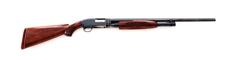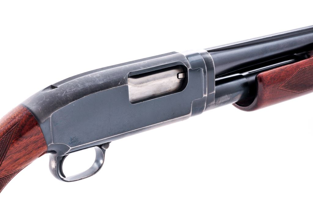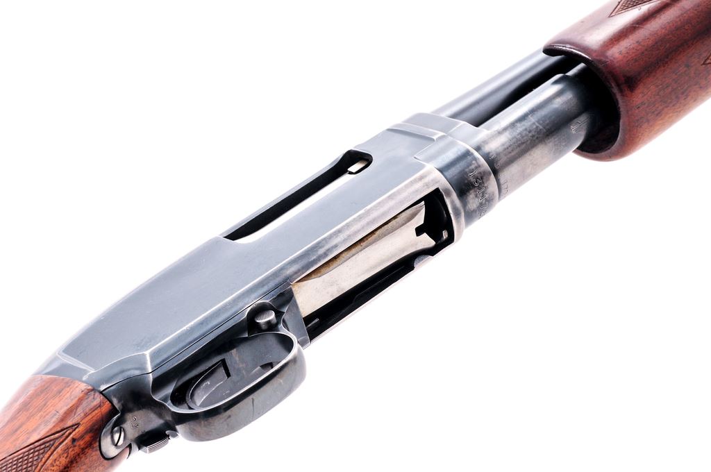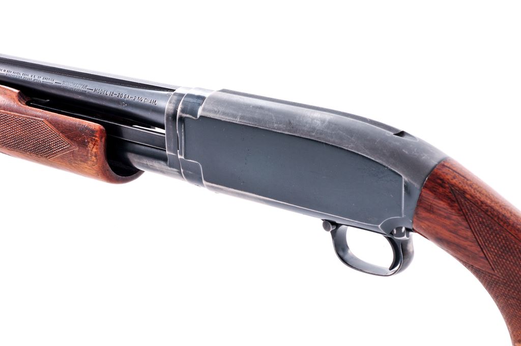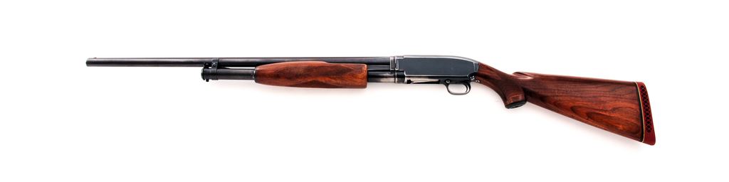 Winchester Model 12 Standard Grade Skeet Slide-Action Shotgun, #1311721, 20 ga. 26'' solid rib barrel has a 2-3/4'' chamber, target beads, and a WS-1 choke. Full forend and pistol-grip buttstock are standard walnut with Winchester checkering, Winchester plastic grip cap and Pachmayr Whiteline recoil pad. Mfg'd 1952. Condition is very good with numerous handling marks to wood and some small scratches to metal, which has much edgewear from use. Action still functions smoothly and locks tight; bore is dirty but not pitted. A nice honest 20 ga. skeet gun. Est.: $600-$800. (C&R)