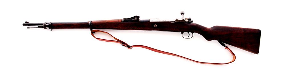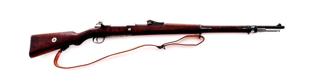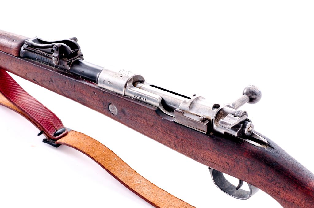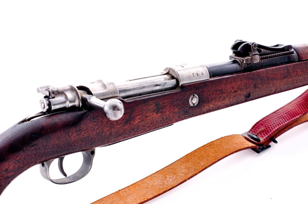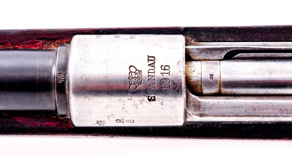 German Model 1898 Mauser Bolt Action Rifle, #8620, 8mm Mauser cal., 29.13'' barrel, blued finish, hardwood stock, inverted ''V'' front sight and adjustable Lange Vizier rear sight. Marked on receiver ring ''(crown)/SPANDAU 1916'', and on left side receiver rail ''GEW.98''. Caliber ''7.9'' and ''S'' are stamped on barrel. Inspection stamps on right side of butt. Bolt has been re-numbered to match (old number lined out); other numbers are mismatched. Stock has bedding material added in chamber area. Cleaning rod is included, along with a reproduction brown leather sling. Condition overall is very good with the receiver bright showing polishing and the barrel refinished, retaining almost all of its bluing; other parts have less than 40% finish remaining. Wood has turned dark from age and has a couple of chips at the buttplate and an old scratch on the right side butt, otherwise very good with scattered scratches and impressions. Action is smooth, bore is bright with good rifling. No visible import stamps. Est.: $400-$600. (C&R)