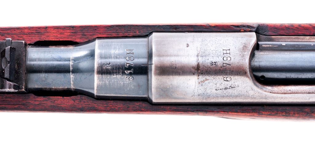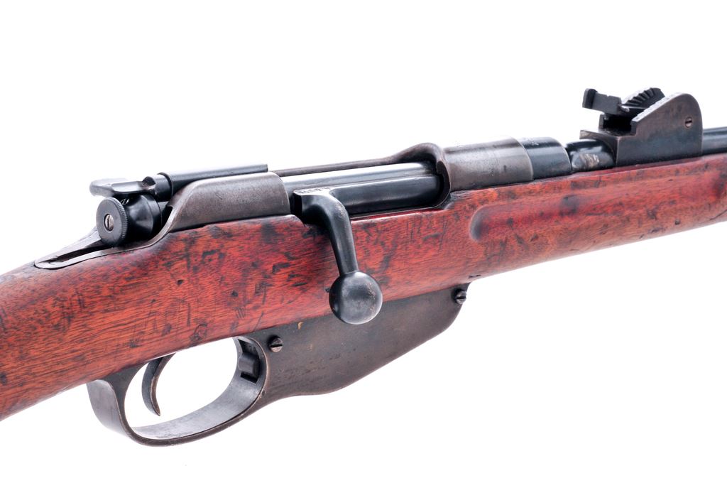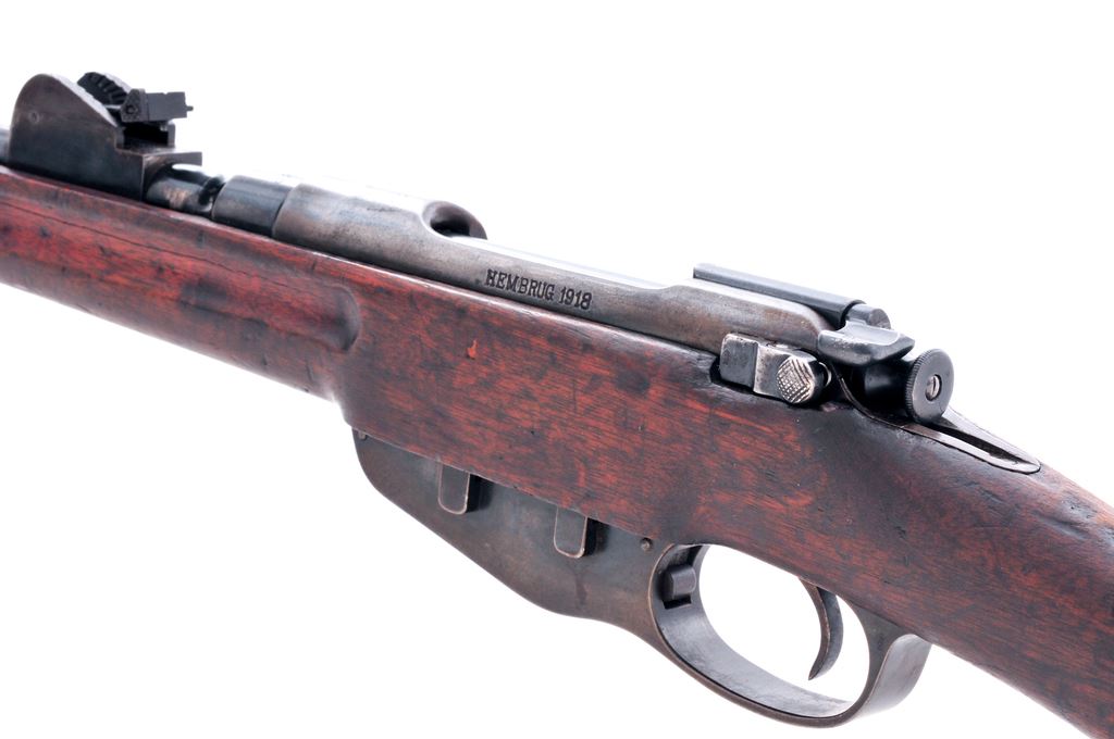 Dutch Model 1895 No.1 Cavalry Carbine, #6178H, 6.5 x 53mm cal., 17.7'' barrel, blued finish, hardwood stock, inverted ''V'' front sight with adjustable leaf folding rear sight. Marked on left side receiver rail ''HEMBRUG 1918''. Faint cartouche on right side of buttstock. Sling bars on left side of stock. Originally had wooden block covering left side of magazine, now missing. Mismatched number on bolt. Cleaning rod attached. Condition overall is very good with approx. 50% bluing remaining on metal surfaces. There is a crack on the left side of the forend and the wood has been lightly sanded, otherwise stock is very good with old dents and scratches. Action is smooth, bore is good showing wear. No visible import stamps. Est.: $200-$300. (C&R)