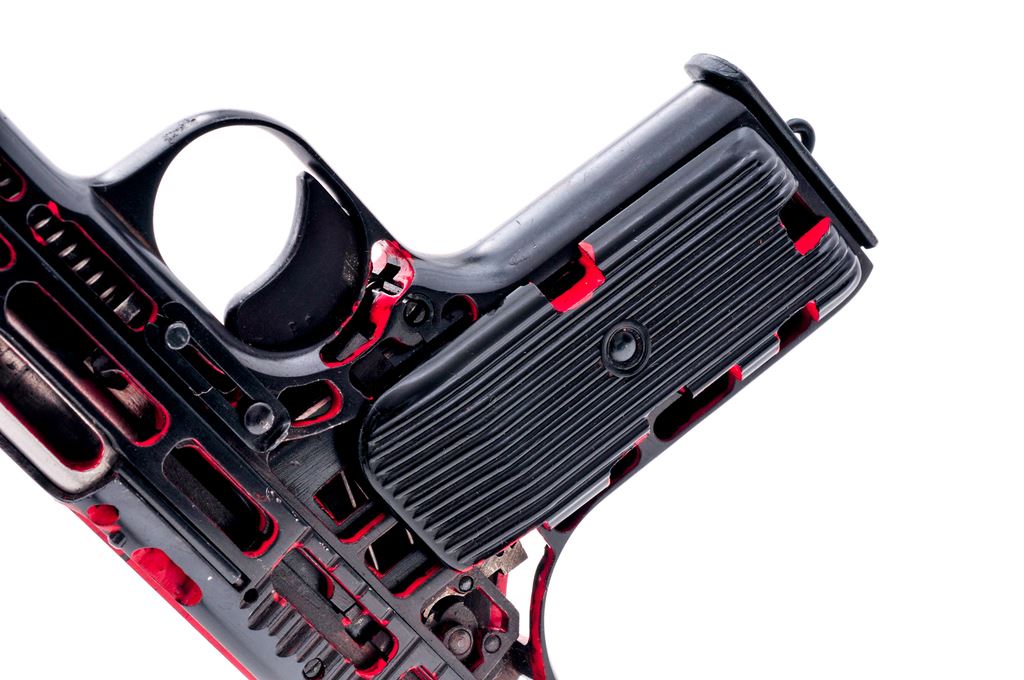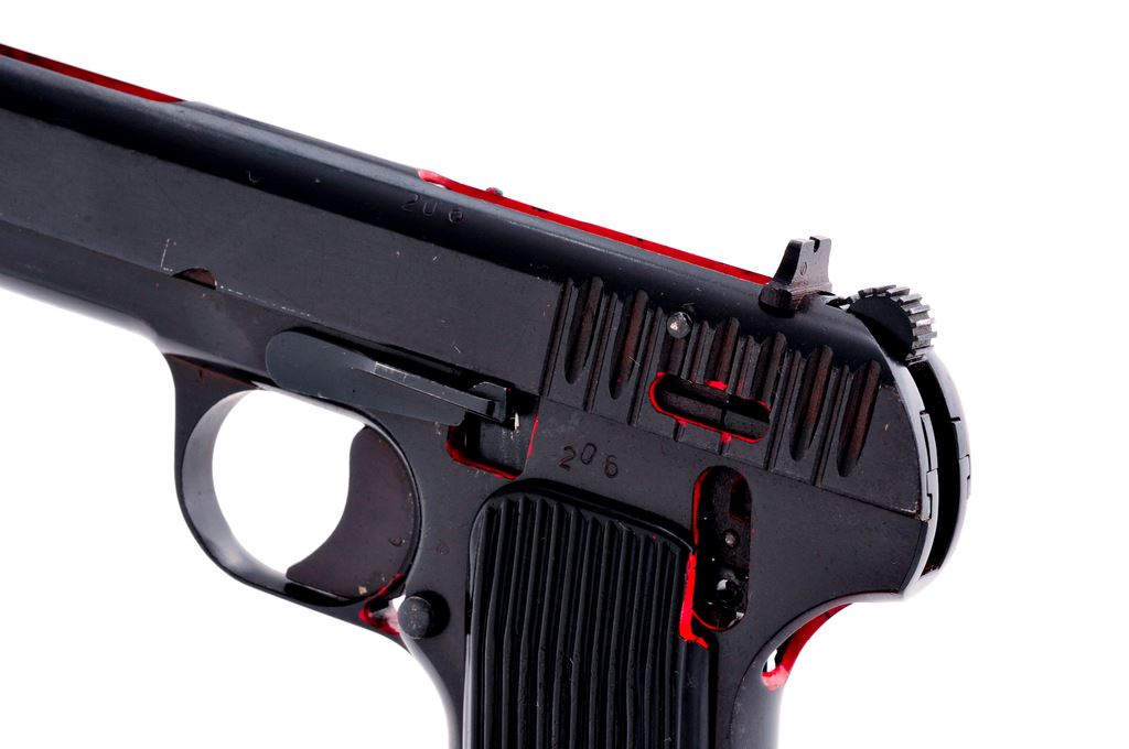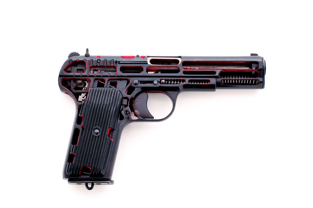 Soviet Tokarev Model TT-33 Cutaway Semi-Automatic Pistol, #206, 7.62x25mm cal., 4.5'' barrel, blue finish, black plastic grips, with standard sights and one magazine with lanyard loop; magazine is numbered #1199. Pistol with several factory cutaway sections that show the inner workings; all are highlighted around edges in red paint. In excellent overall condition, showing scattered light handling marks and light wear to the red paint. An interesting display or reference piece. Although this pistol is not intended to be fired, it requires an FFL for transfer. Est.: $400-$600. (Modern/PPT)(Joe Poyer collection)