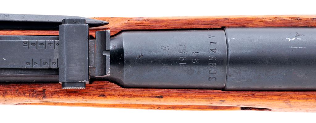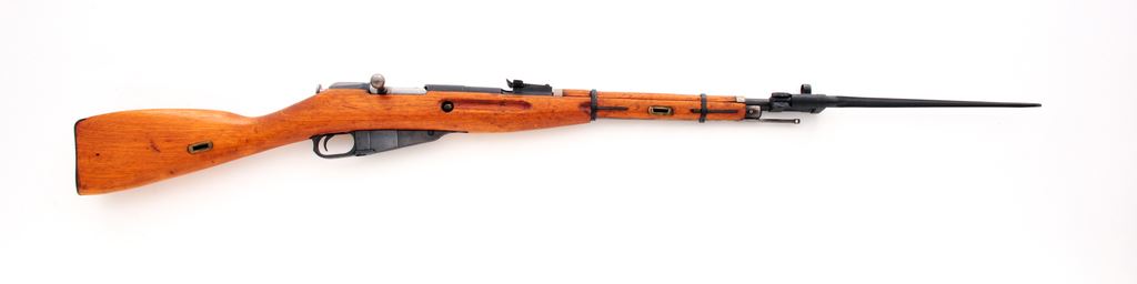 Chinese Type 53 Mosin-Nagant Bolt Action Rifle, with side folding bayonet, #3095417, 7.62x54R cal., 20.4'' barrel, blued finish, hardwood stock, marked on receiver ring with Chinese characters over ''1955/26''. No markings on bolt except Soviet style fletched arrow stamped on underside of handle. Matching number on magazine floorplate; mismatched number on buttplate. Condition overall is very good with approx. 80% blued finish remaining on metal surfaces. Wood is very good with applied varnish over old dents and scratches and a small rough area under the bayonet blade. Bayonet is very good with a small flat area on one side of the blade; catch assembly operates smoothly. Action is smooth, bore is dark with very good rifling. Import stamped on right rear of receiver. Est.: $300-$400. (C&R)