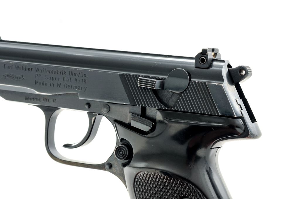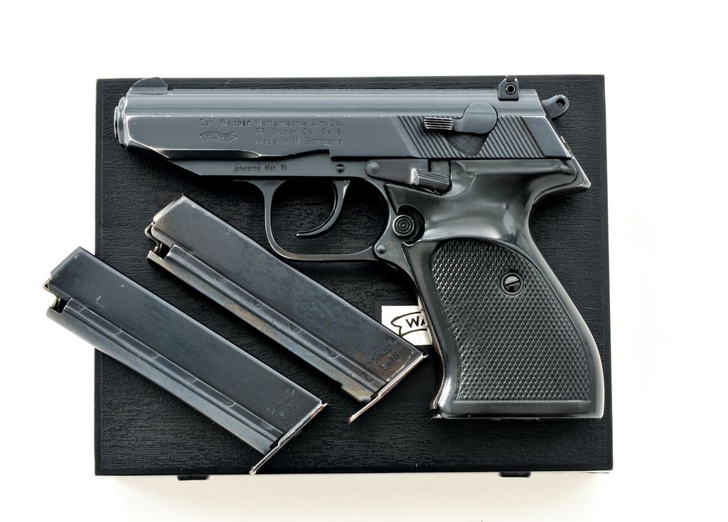 West German Police Walther Model PP Super Semi-Automatic Pistol, #17066, 9x18mm ultra (police) cal., 3-5/8'' barrel, blue finish, checkered black plastic grips, white dot front sight, with windage adjustable rear sight. Included are three (3) factory magazines, in original black plastic Walther case with matching end label, owner's manual, test target, and other misc. factory paperwork. Left side of frame is marked ''Interarms, Alex. VA.'', with various German proofmarks, as well as ''X'd'' out police markings to right side of frame. Condition is very good to near fine with approx. 95% blue finish remaining. Edgewear as well as thinning and freckling to the front grip strap account for a majority of the finish loss. Right grip with an approx. .25'' hairline crack to the upper edge; left grip with one noticeable spot of flattening to the checks, otherwise both show moderate handling marks. Excellent action with a nice bright bore. Est.: $350-$500. (C&R/PPT)