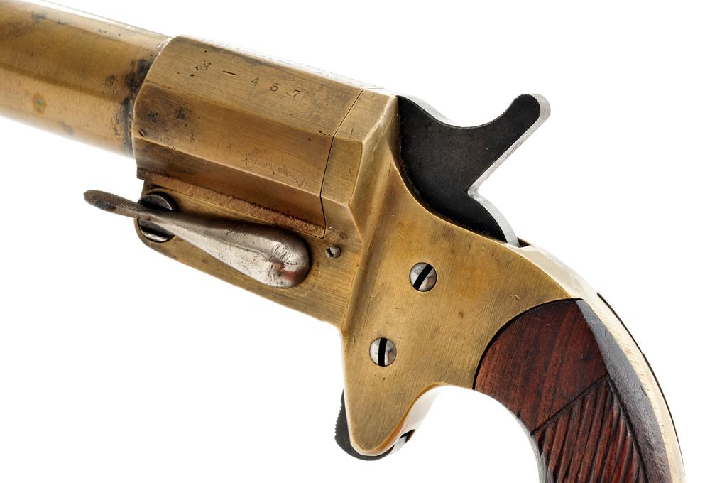 WWI Era A.H. Fox Gun Co. Mark IV Very Pistol, #3-457, 25mm, 4'' brass barrel, brass frame, grooved walnut grips, with lanyard ring. Right side of frame is marked with Canadian ''C / (broad arrow)''. Top of barrel is marked ''VERY PISTOL 25MM MARK IV / A.H. FOX GUN CO. PHILA. PA. U.S.A.''. Condition is very good. Metal shows moderate wear; barrel with some minor surface peppering. Maker's marks are clear. Brass appears to have been lightly cleaned. Hammer and trigger are smooth and tight; good bore. Est.: $150-$300.