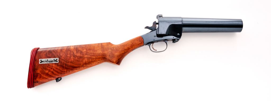 Harrington & Richardson Gas Rifle, #3155, 37mm, 10'' barrel, 28'' overall, blue finish, case hardened hammer and trigger, wood stock with red rubber recoil pad. Rifle also features slings swivel rings mounted to the bottom edge of the buttstock and frame. Right side of buttstock with a small ''American Munitions Co.'' plaque. Top of barrel reads ''HARRINGTON & RICHARDSON ARMS CO. / WORCESTER, MASS. U.S.A.'' Condition is very good. Metal surfaces retain most of its blue finish; barrel with scattered tiny specks of pitting. Maker's marks are clear and sharp; serial number is just a little thin in some areas. Wood with a nice oil finish, with some small intermittent shallow dents and scratches. Wrist with a hairline crack that runs from the lower tang and up the right side towards the pistol grip. Action functions properly with a smooth hammer and trigger; bore is fine. Est.: $300-$500.
