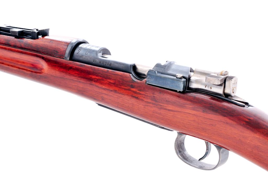 Swedish Model 96/38 Mauser Bolt Action Rifle, #OG40706, 6.5x55mm cal., 24'' barrel, blued finish, hardwood stock, blade front sight and adjustable tangent rear sight. Marked on receiver ring ''WAFFENFABRIK MAUSER OBERNDORF A/N 1900''. Brass disc in place on right side of buttstock which shows bore and throat information. Threaded barrel. Matching numbers except rear barrel band. Comes with cleaning rod. Range decal removed from left side of buttstock. Condition overall is very good with approx. 80% finish remaining on the metal, with thinning on the triggerguard and floorplate and black paint applied to the buttplate. Wood has been sanded and a high gloss varnish applied. Action is smooth, bore is excellent with sharp rifling. Import stamped on underside of barrel. Est.: $300-$500. (C&R)