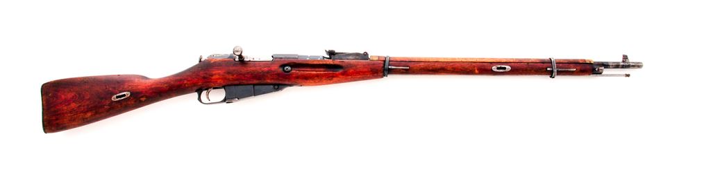 Soviet M91/30 Mosin Nagant Bolt Action Rifle, #13228, 7.62x54R cal., 28.7'' barrel, blued finish, hardwood stock, blade front sight and adjustable tangent rear sight. Imperial Russian crest faintly visible on octagon receiver. Marked on barrel with ''(Soviet crest)/1932r/D'' over the fletched arrow inside triangle symbol of the Izhevsk Arsenal. Also stamped with the ''SA'' Finnish property stamp on left side of barrel indicating probable capture from Soviet forces during WWII and re-issue to Finnish forces. Two faint cartouches stamped on right side of buttstock. Mismatched number on bolt. Includes cleaning rod. Condition overall is very good with approx. 50% of the blued finish remaining on metal surfaces with thinning and patina across the barrel and receiver. Stock is very good with impressions and overall dents and scratches. Action is smooth, bright bore is excellent. Import stamped on right side of barrel. Est.: $300-$500. (C&R)