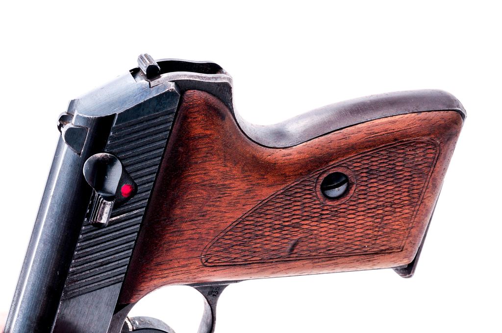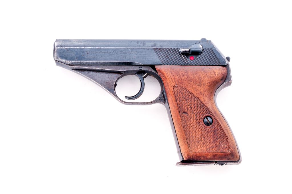 Nazi marked Mauser HSc Semi-Automatic Pistol, #935969, 7.65mm (.32 ACP) cal., 3.25'' barrel, blue finish, checkered walnut grips, with standard sights, and one magazine marked with Sauer & Sohn ''SuS'' monogram that also reads ''CAL. 7.65''. Right rear portion of triggerguard is marked ''(eagle) / N''; left ''(stick eagle) 135'' Waffenampt. Barrel, frame, and slide with matching numbers. Condition is good with approx. 80%-85% thinning factory blue remaining. Metal with some light oxidation in protected areas and intermittent small spots of light surface peppering. German proofmarks are clear. Right grip with a chip at the upper rear corner; both show moderate age and wear, including shallow surface dents and scratches. Action is excellent, with a fine bore. A thorough cleaning would probably improve the overall condition. Est.: $250-$450. (C&R/PPT)