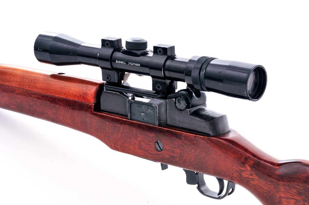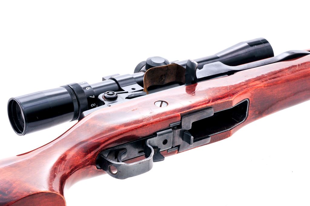 Late 70's Ruger Mini-14 Semi-Auto Project Rifle, with scope, #181-01409, .223 cal., 18.5'' barrel, blue finish, original wood stock with buttplate, sling swivels, fixed blade front sight, aperture rear sight, no magazine. Topped with a 3-9x32 scope with duplex reticle. A thin piece of brass sheet metal has been attached underneath the scope base to add as a case deflector. Mfg'd 1977. Condition is good. Metal with some specks and small patches of very light pitting and surface rust. Muzzle and highpoints with some thinning and finish loss. The walls of the magazine well with an added thin layer of a bedding type material. (Although this rifle does not come with a magazine, we did test one out. It fits tight and needed to be pushed from inside the chamber area downward in order to get it out.) Stock shows age and wear consistent with the rest of the rifle, including surface scratches and impressions. Action is good; bore with some light pitting. Scope exterior with thin scratches and scuffs; optics are clear; reticle has become detached in the center and needs repair. Est.: $200-$300. (Modern)