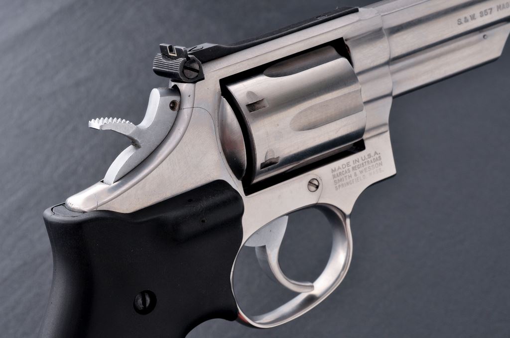 Smith & Wesson Model 66-2 Combat Magnum Double Action Revolver, #AEU4494, .357 mag. cal., 4'' barrel, satin stainless steel, checkered black Crimson Trace laser grips, red ramp front sight, and white outline fully adjustable rear sight. Metal surfaces rate as very good+ showing general light scratching and other small handling marks from range use. Cylinder face and inside of frame show powder residue consistent with the overall condition. Grips are excellent and appear near new; laser was tested and functions properly. Action is smooth and crisp; very good bore shows signs of moderate use. Est.: $500-$700. (Modern/PPT) (Paul Hantke collection)